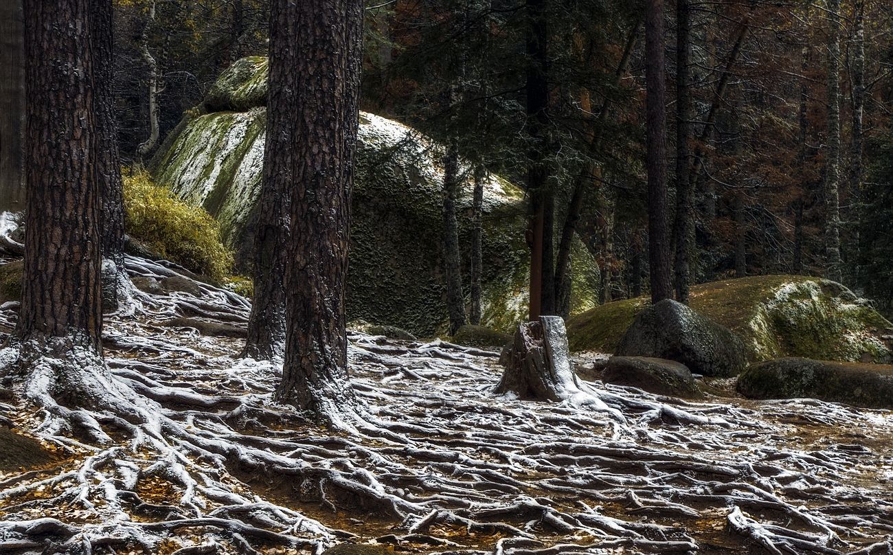 У меня есть кадры тридцатилетней давности, где я со своим сыном в этом месте, корни другие и деревья другие, а вот деревце на камне продолжает стоять, для него ход времени замедлился ...