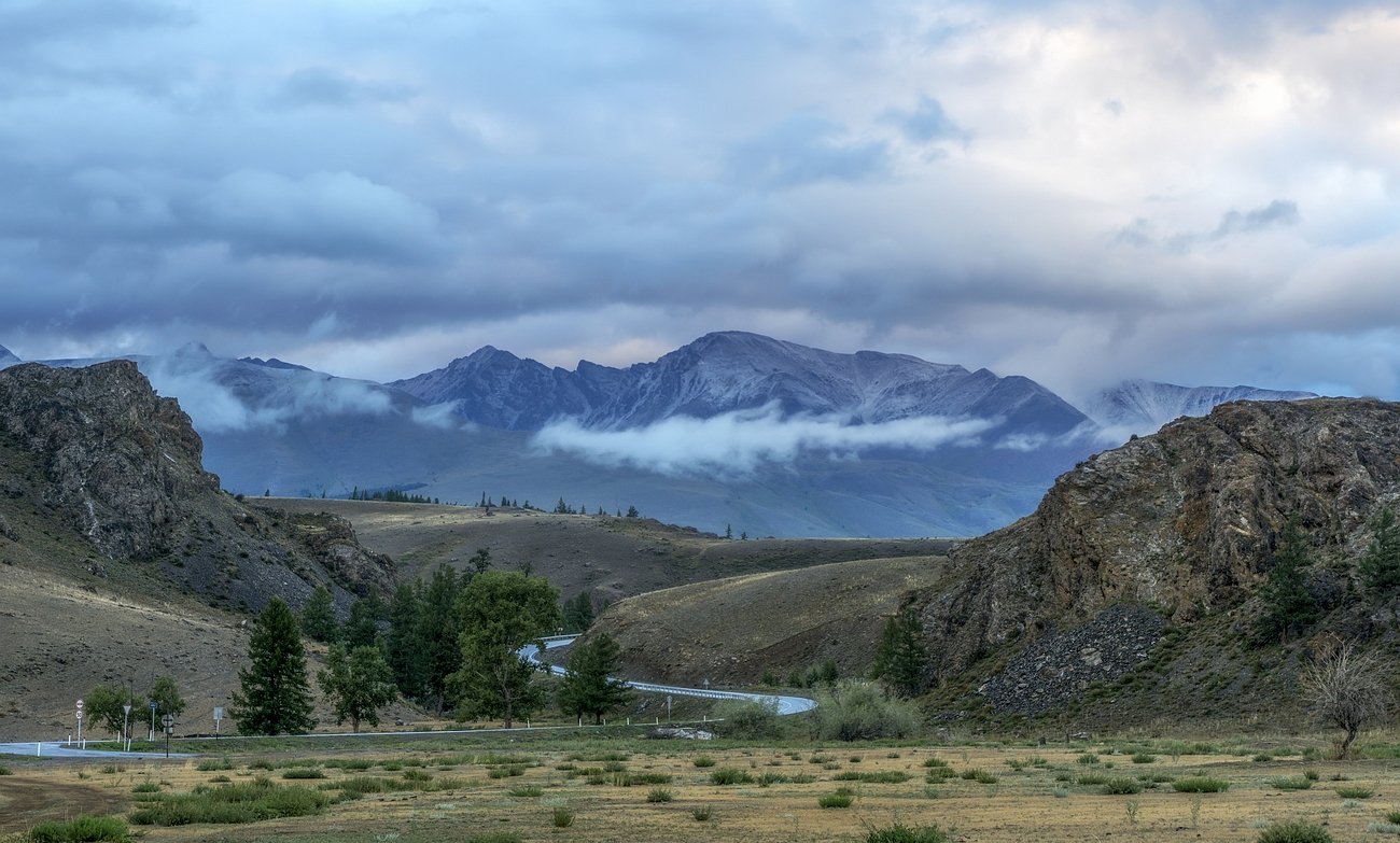 На горе справа шикарный вид открывается, но снежные горы были закрыты. Всю ночь шел дождь, а на горах на ЗП шел снег. А после съемок пришлось возвращаться домой.