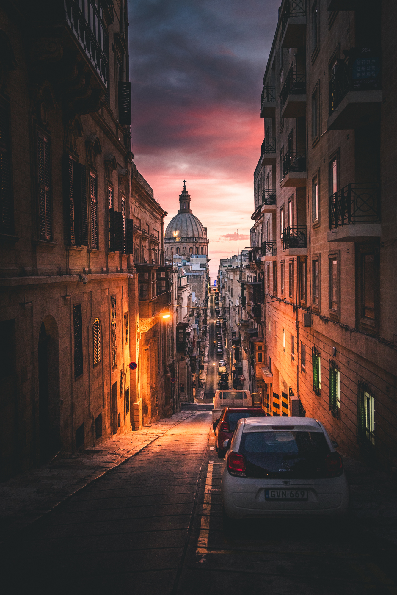 Узкая улица в центре Валлетты, Мальта, в вечернее время. Теплый свет уличных фонарей освещает старинные здания, вдали — купол церкви на фоне драматического неба. Сцена передает атмосферу тишины и уюта в историческом городе. Фотография отражает гармонию архитектуры и природного света в момент перехода от дня к ночи. Кононов Анатолий.