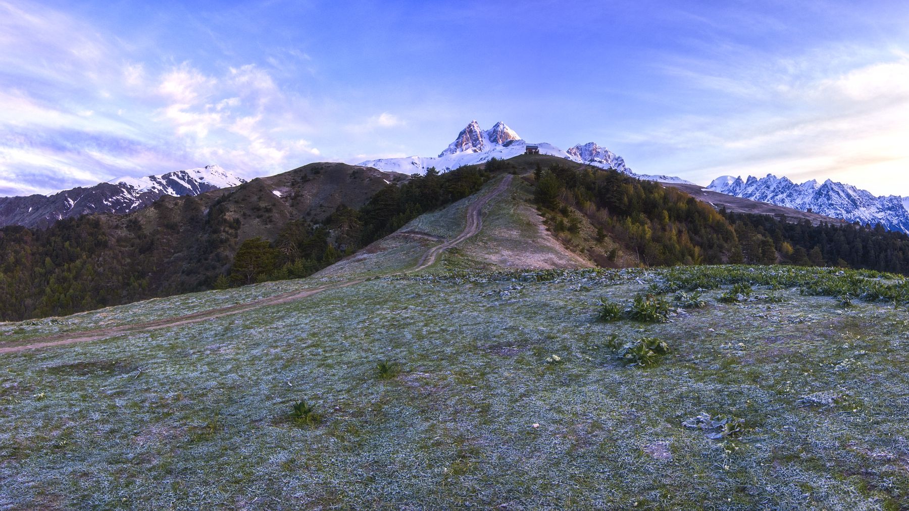 Грузия.Сванетия. Поселок Местиа. Добраться на место съемки можно только на внедорожнике и в хорошую погоду.Высота горы 4710 метров.Утро. Панорама из 5 вертикальных кадров.