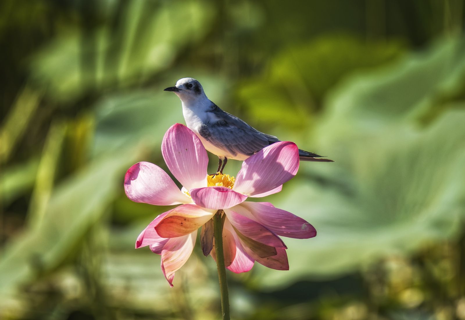 Астраханский государственный заповедник. Дамчик. Молодая белощекая крачка на цветке лотоса. Живет в зарослях лотоса.Длина тела 23 см. Снять на цветке лотоса большая удача.