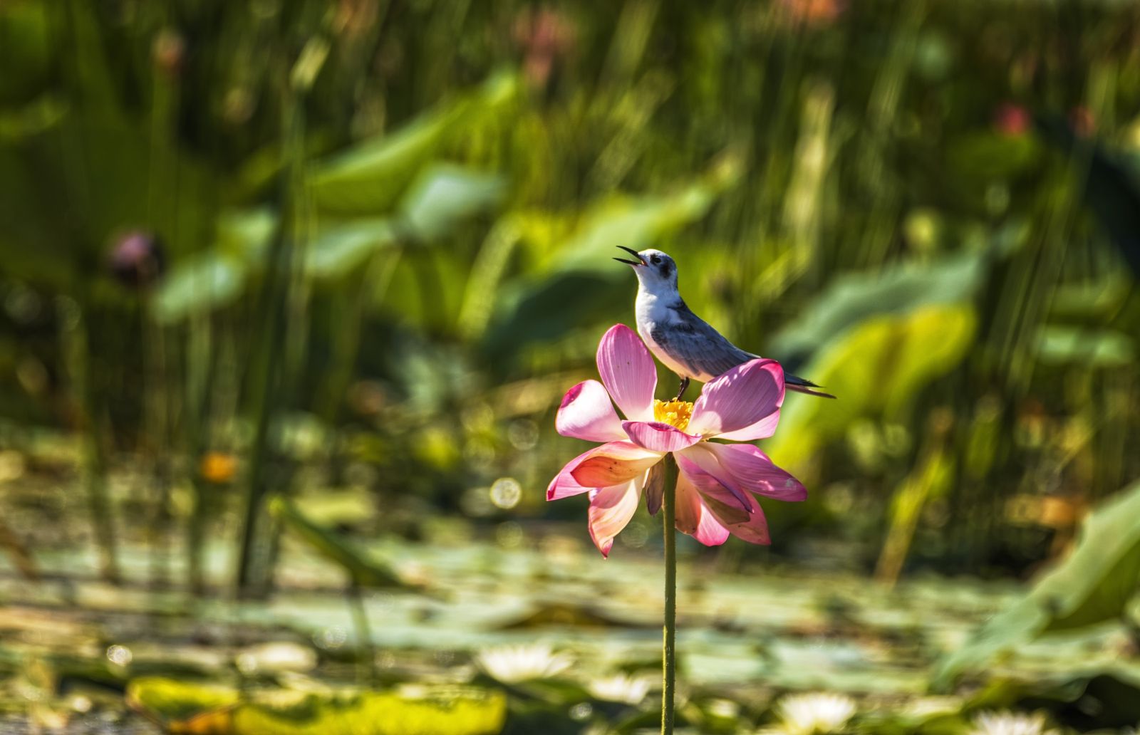 Астраханский государственный заповедник,Дамчик.Молодая белощекая крачка сидит на цветке лотоса,Длина ее тела всего 23 см.Обитает в зарослях лотоса,Снять ее на цветке лотоса большая удача,