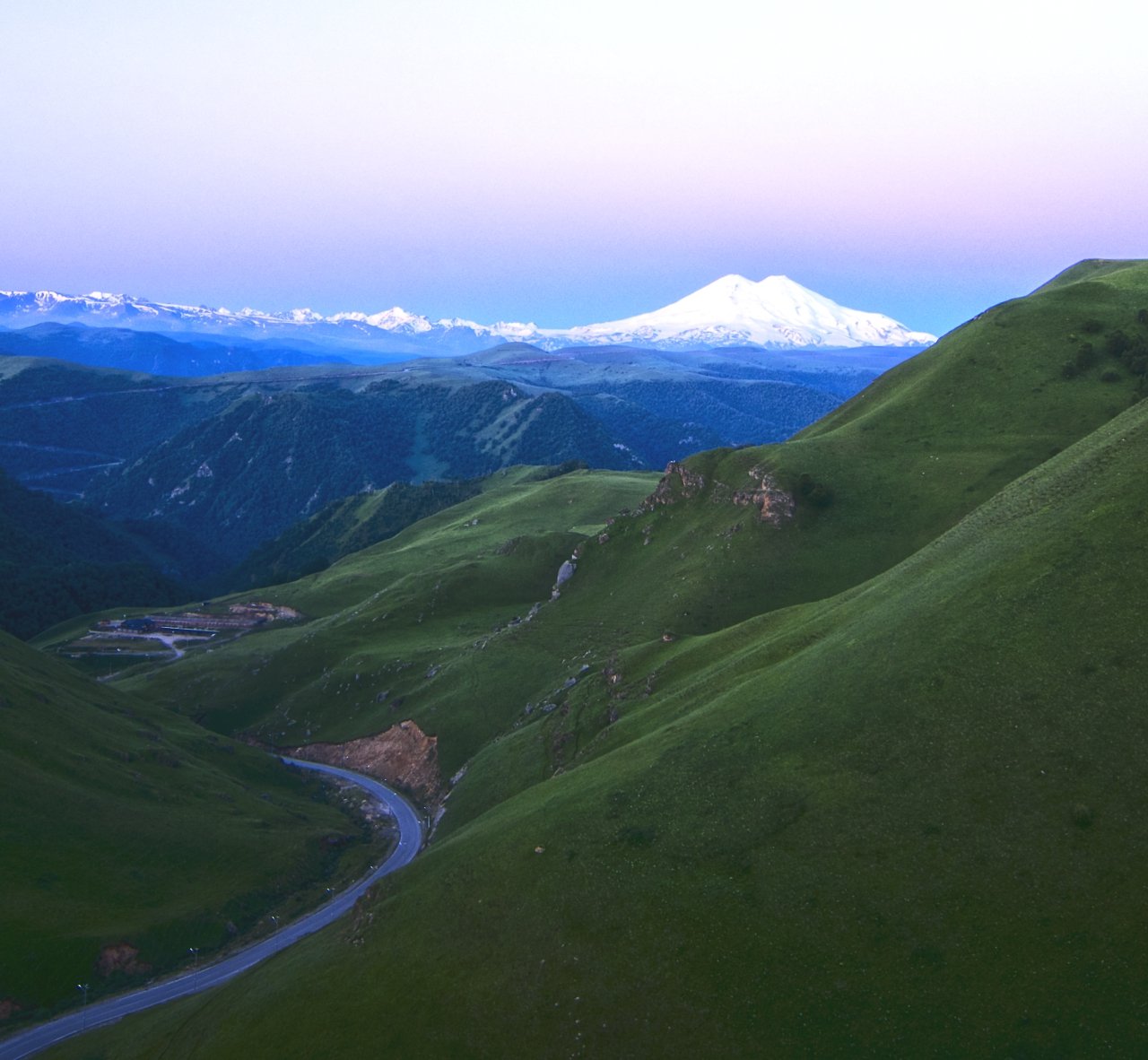 Кавказ. Кабардино-Балкария. По дороге к урочищу Джилы-Су. Как правило Эльбрус закрыт облаками и его не видно.Ранним утром он показывается, а потом снова в облаках.
