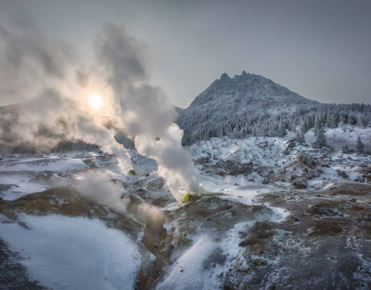 В этом году мы исследовали не только зимний Итуруп, но и Кунашир (графику мыса Столбчатый я уже показал). Зимой и на этом острове отдельные места выглядят гораздо интереснее (по моему личному мнению)! Вот, например, фумарольное поле вулкана Менделеева!