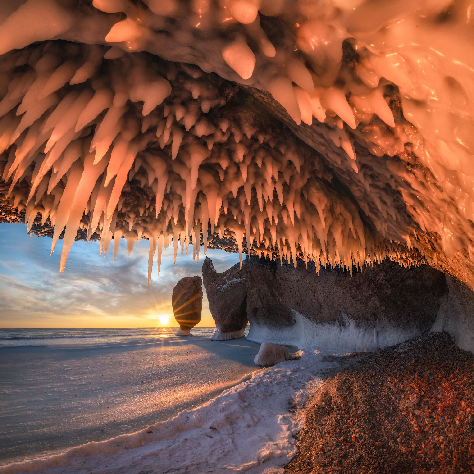 Ледяные наплески после шторма в лучах восходящего солнца! Это как раз то, за что я люблю зиму в Приморье!