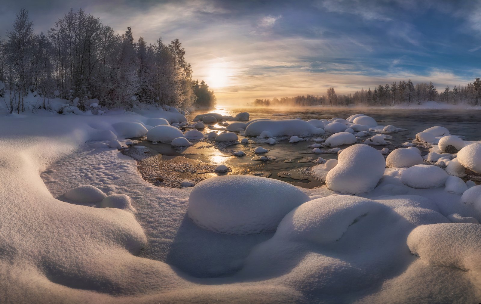 Зимой на берегах северных рек всегда можно отыскать удивительные фактуры. А если еще удастся застать мороз, то река начинает парить, а деревья вокруг обрастают толстым слоем инея, создавая сказочную картину. Полярнозоринский район, Кольский полуостров. Фототур по Кольскому полуострову в ноябре 2019г.: http://photogeographic.ru/kola-1119/