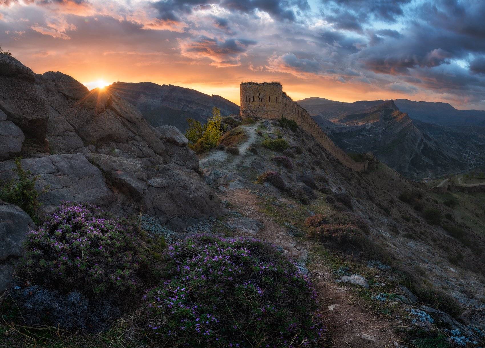 На фотоснимке красочный майский рассвет у башни Шамиля, которая находится в поселке Гуниб. Всего 5 минут езды от отеля + 10 минут на подъем, и мы здесь, на гребне скалы, откуда на 360 градусов открываются панорамные виды на великолепные горные пейзажи Дагестана! Именно здесь в 1859 году пленили имама Шамиля, что послужило окончанию Кавказской войны.
