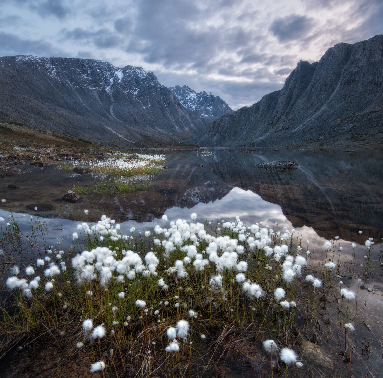И снова озеро Фотографов, на этот раз вид с берега. Пушица - очень распространенное растение на Колыме, и оно часто помогает гармонично заполнить передний план в кадре.
