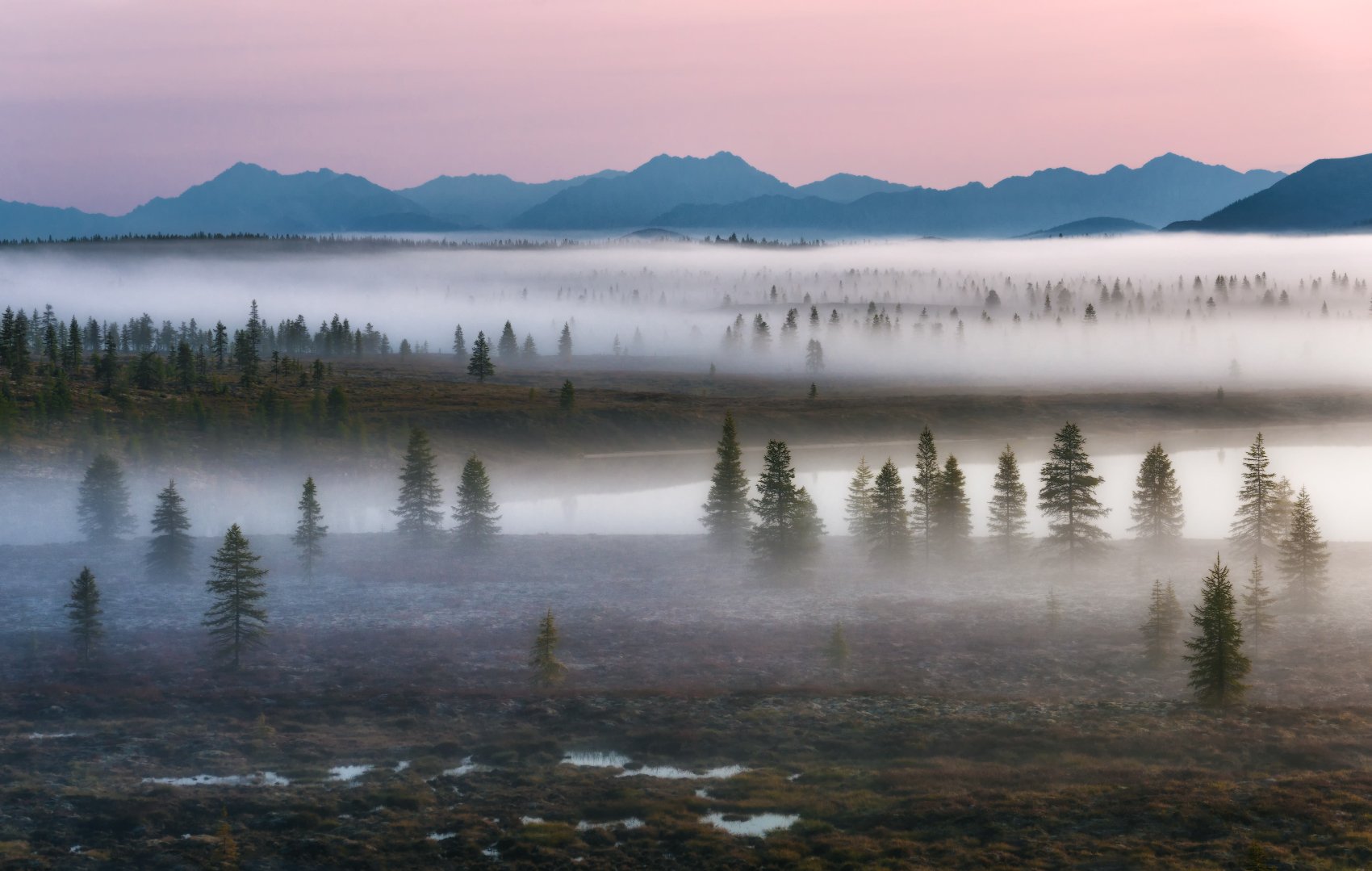 Немного разбавлю Итуруп фотографиями из предшествующей фотоэкспедиции по Колыме. Почти каждое утро у устья Момонтая туман обволакивал лесотундру тонкой пеленой. А если утром есть туман, то это утро непременно становится волшебным!