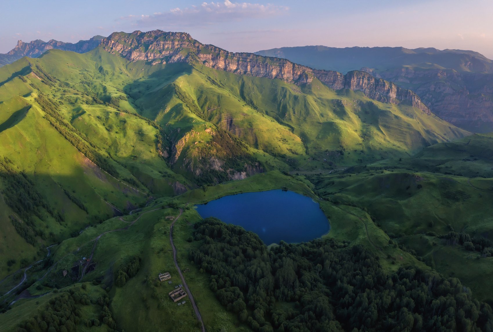 Лагерь мы разбили на берегу озера, а вечером к нам пришел грозовой фронт и дождь лил до глубокой ночи. Лишь под утро небо очистилось, как часто бывает на Кавказе, и мне удалось поснимать окрестные виды с дрона в мягком утреннем свете. В июне здесь все цветет и пахнет, вокруг пышные травы и цветы! Неудивительно, что в Чечне много пасек.
