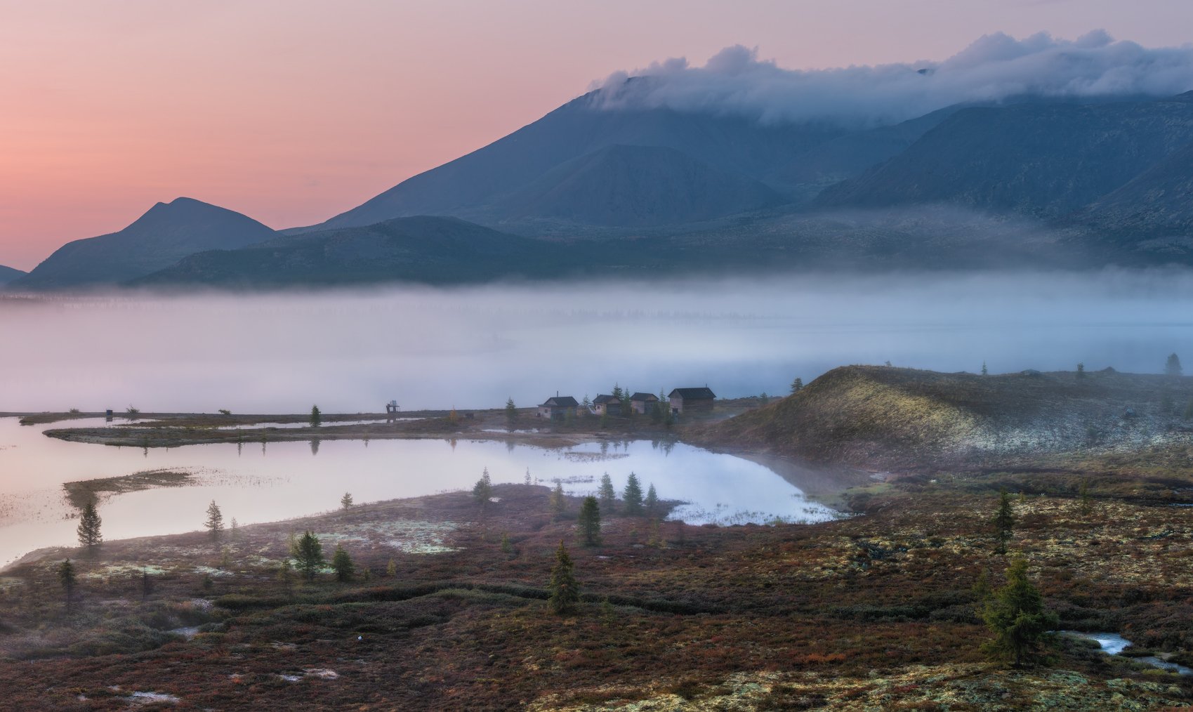 Прекрасное утро на озере Момонтай. В этом удаленном и труднодоступном месте золотодобывающей артелью были построены несколько деревянных домиков. Здесь мы базировались во время нашей прошлогодней экспедиции. Крыша над головой и тепло печи здесь бесценно!