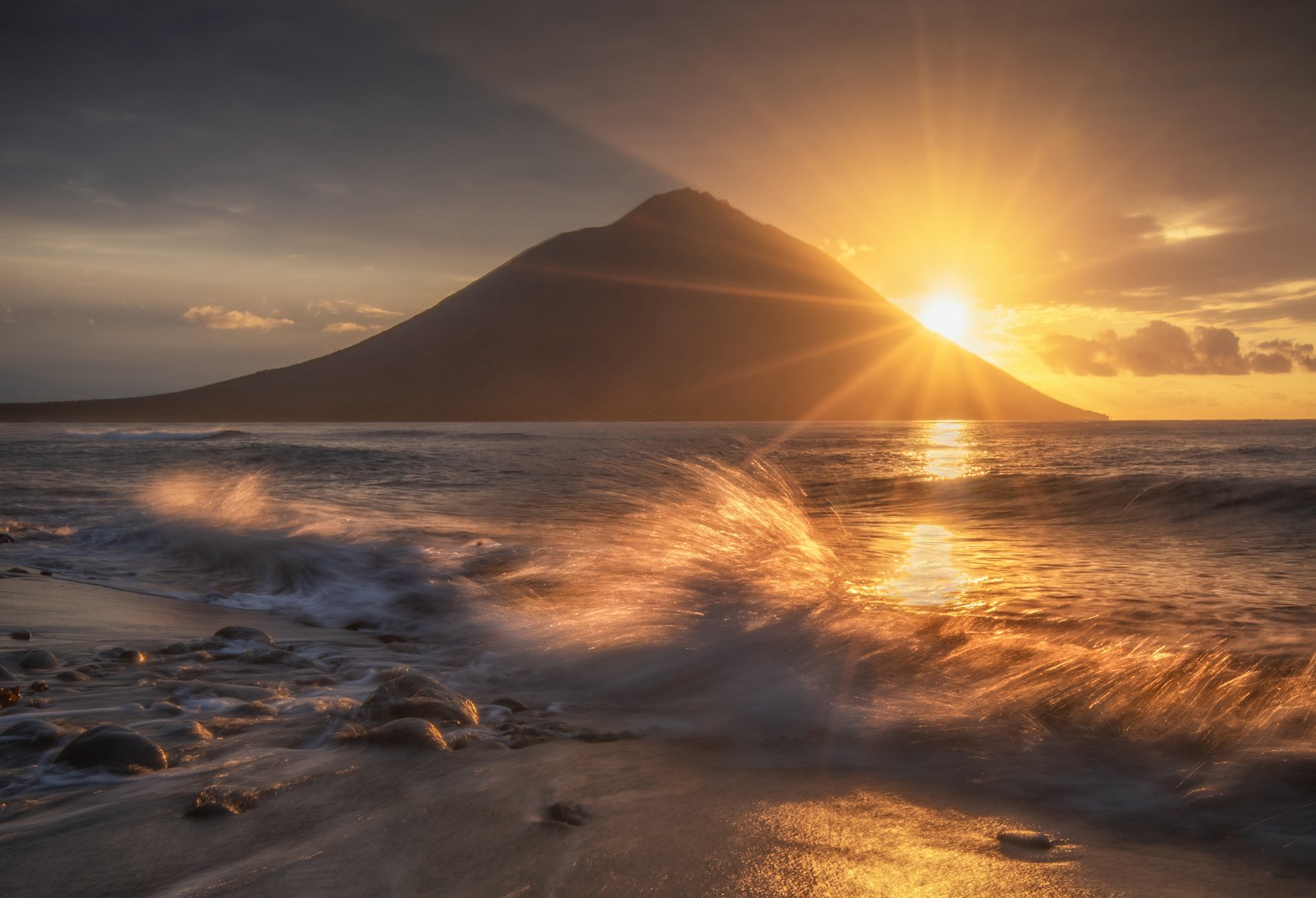 Путешествуя по Итурупу, второй год подряд самый красочный закат мы ловим в Одесском заливе с видом на вулкан Атсонупури.
