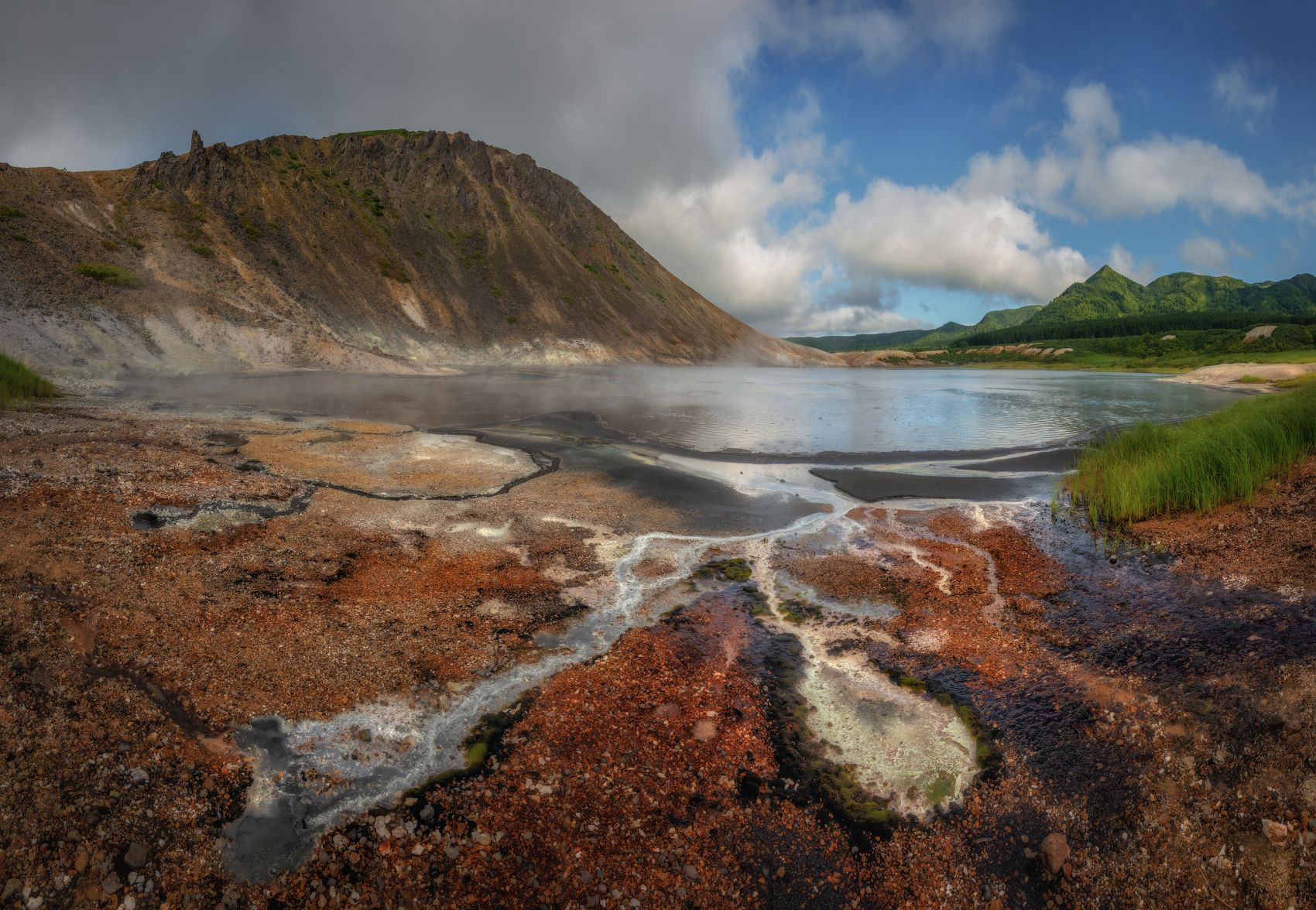 Озеро Кипящее в кальдере вулкана Головнина на острове Кунашир. Вода здесь подогревается вулканическими газами. Температура воды в озере, вопреки названию, не очень высокая, она даже вполне комфортна для купания. Однако здесь, со дна озера, постоянно происходят залповые выбросы кипятка, в котором можно легко обвариться. А коварство добавляет тот факт, что эти выбросы происходят в разных местах, которые невозможно спрогнозировать. Поэтому, купание в озере опасно для жизни! Зато со стороны озеро выглядит очень симпатично )