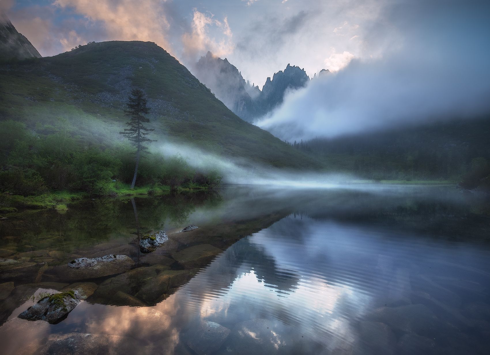 На снимке небольшое озерцо возле нашего базового лагеря. Горный хребет Дуссе-Алинь, июль 2021.