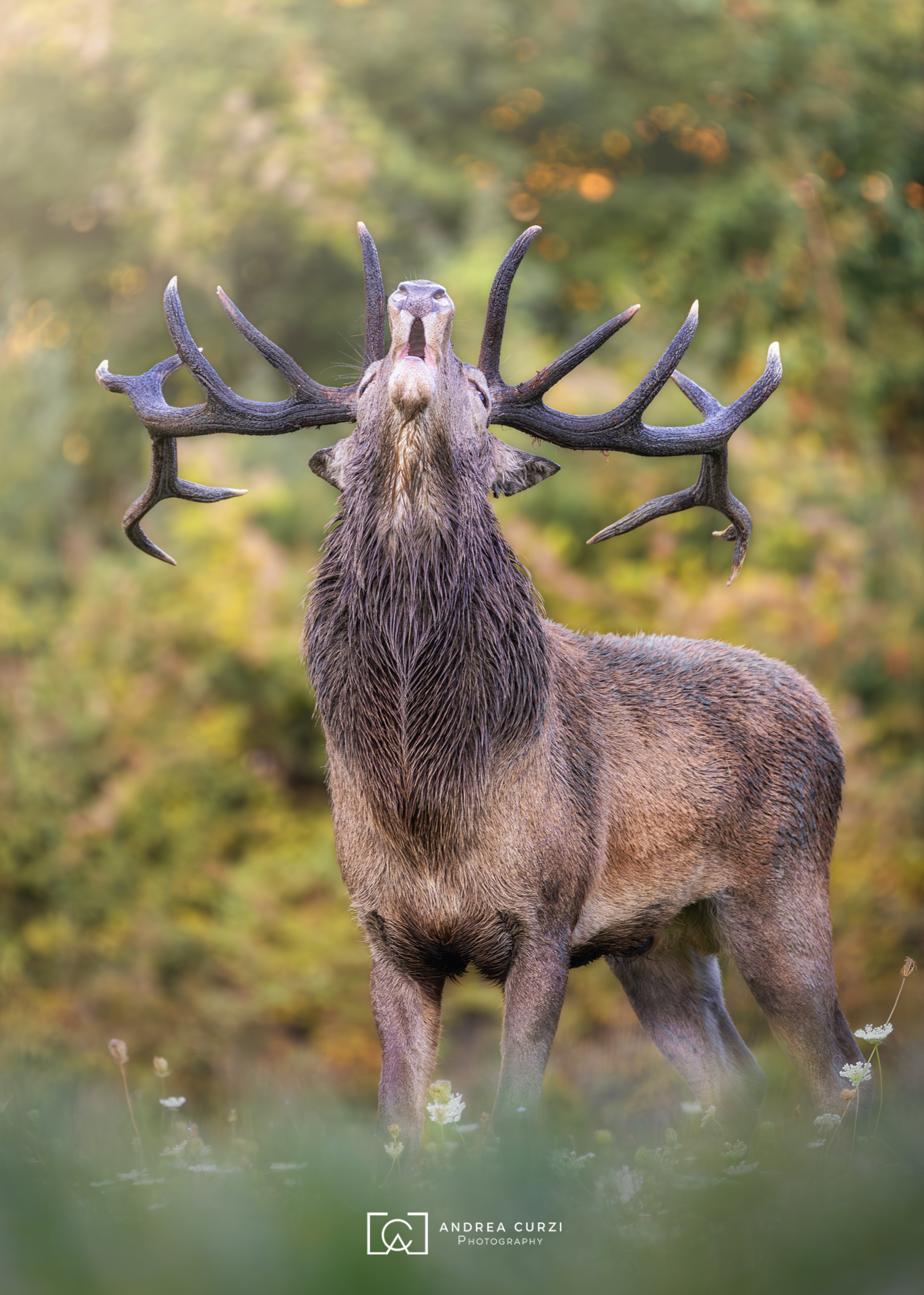 Strong composition, with the stag’s bellow framed against soft, warm foliage. The light on the antlers and neck adds a raw, natural presence.