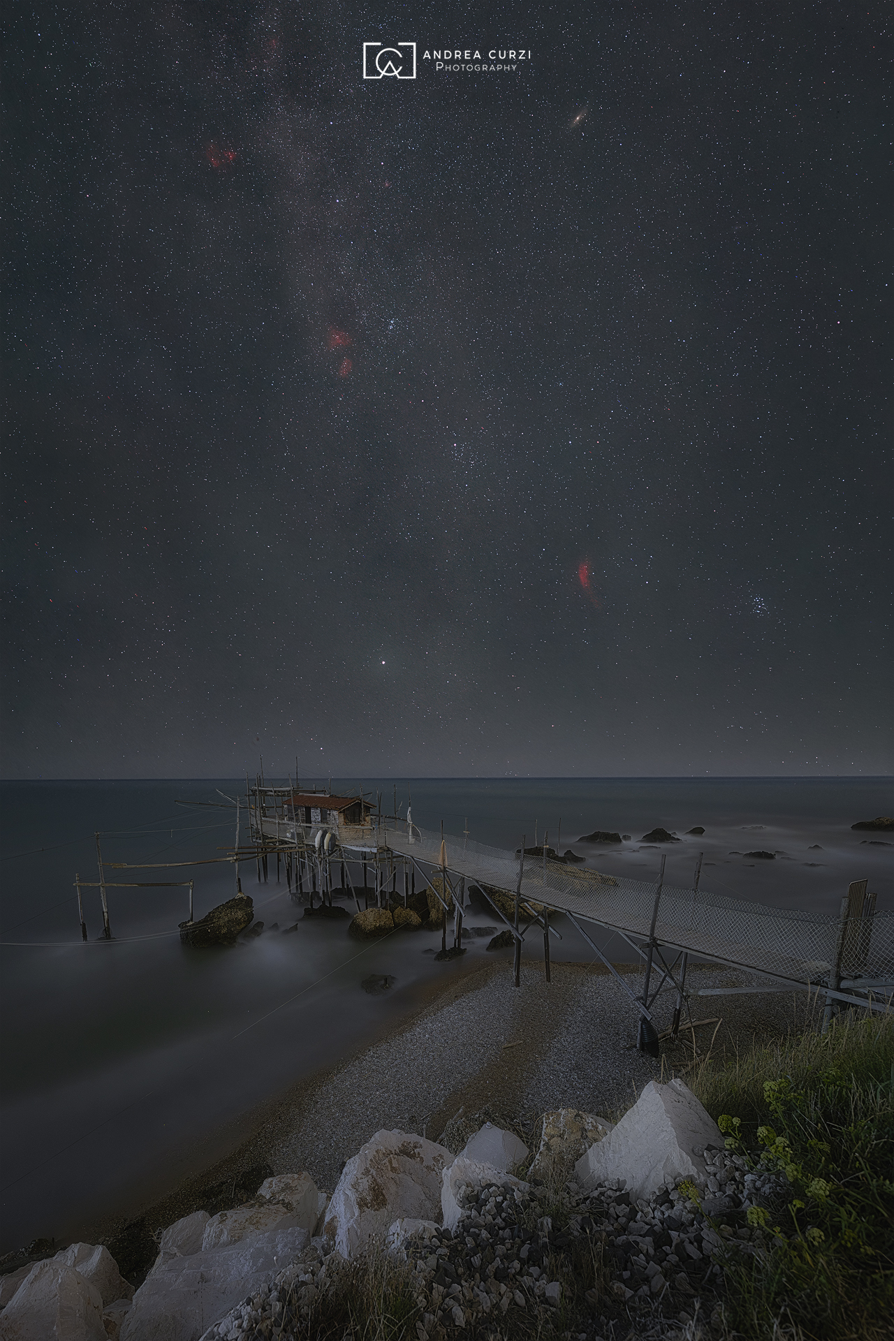 Фотография Андреа Курзи запечатлела тихую ночную сцену у морского побережья. Деревянные причалы уходят в воду, а над ними — густое звёздное небо с ярким Млечным Путём. Долгая выдержка передаёт движение звёзд и спокойствие воды. Снимок сочетает элементы пейзажной и астрофотографии, подчёркивая гармонию природы.