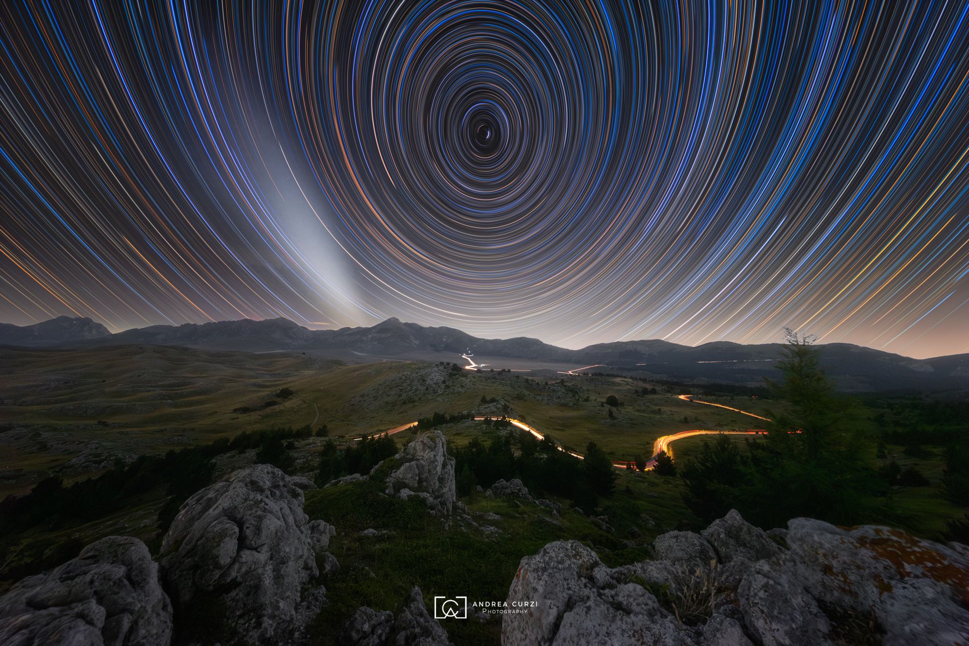 Эта фотография — результат многочасовой экспозиции, когда камера фиксирует движение небесных тел. Звёзды не просто мерцают — они описывают дуги вокруг оси вращения Земли, что особенно заметно вблизи Полярной звезды. Горы и дорога внизу остаются статичными, создавая контраст между вечным движением космоса и неподвижностью земли. Такой снимок требует точного планирования, выбора места и терпения — ведь каждая секунда выдержки добавляет ещё один штрих к звёздному танцу.