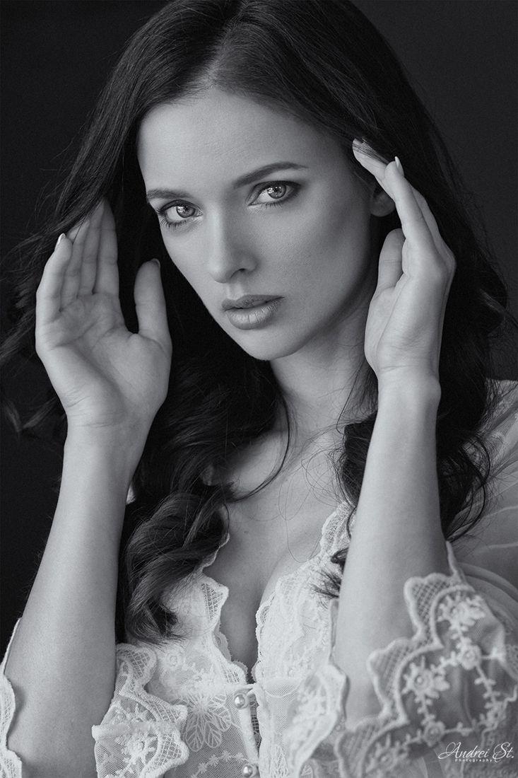 Черно-белый портрет передает глубину и эмоциональность момента. Женщина в кружевной блузке, с руками у лица, смотрит прямо в объектив — взгляд пронзает, а свет мягко моделирует черты. Фотограф Андрей Ст. использует минимальный фон, чтобы акцентировать внимание на выражении лица и текстуре одежды. Изображение сочетает в себе элегантность и внутреннюю силу, характерные для современного фотожурнализма.