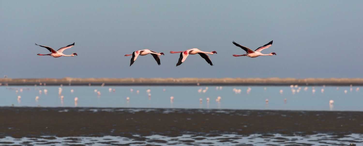 Колония фламинго рядом с городком Walvis Bay, Намибия