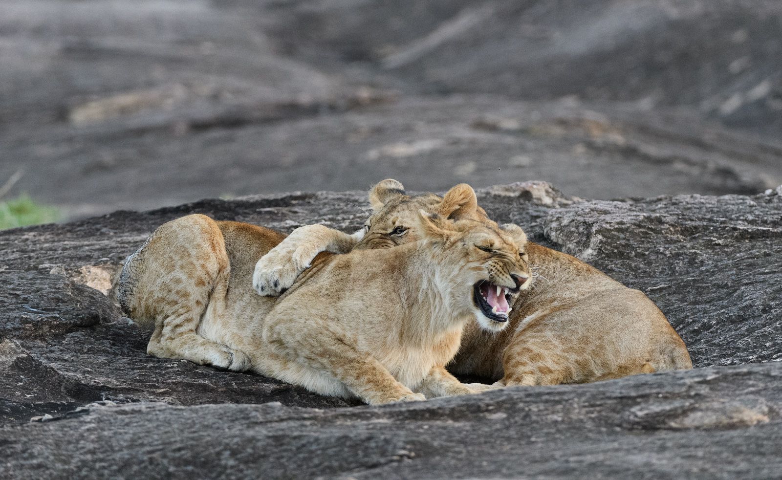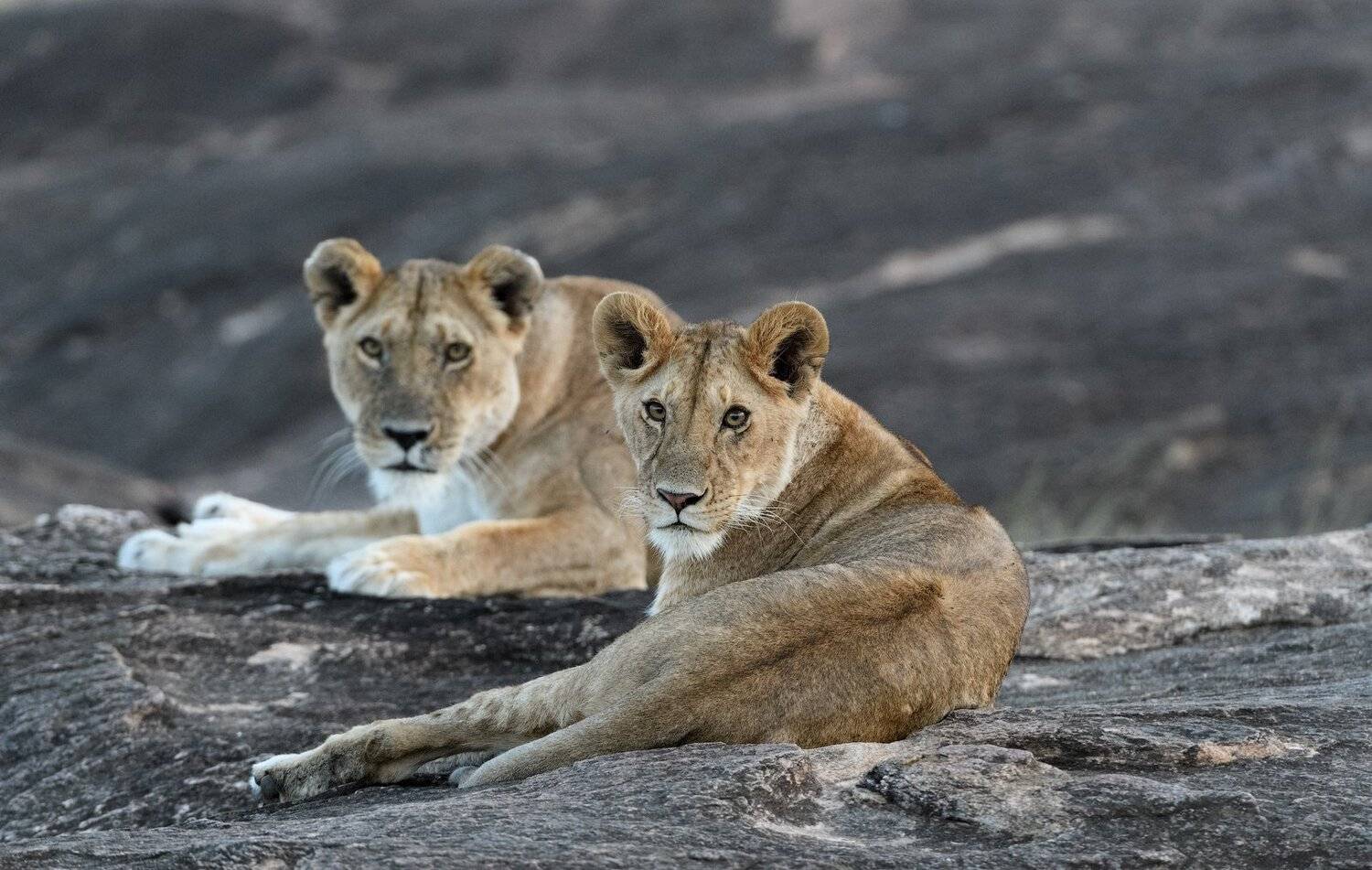 Парочка молоденьких львиц отдыхала на подогретых африканским солнцем камушках в то время, когда мы проезжали мимо. Кения, национальный парк Masai Mara.