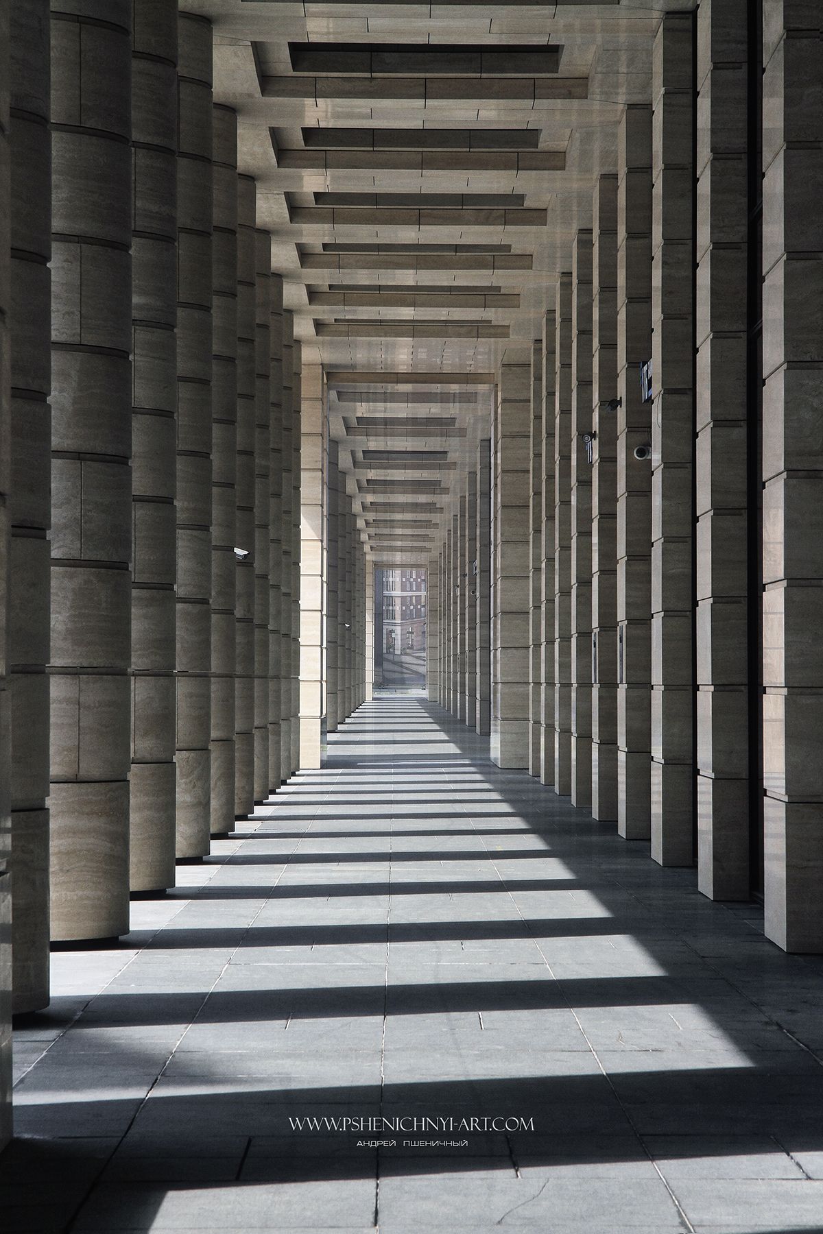 Ритмичный свето-теневой рисунок колоннады уводит взгляд в глубину кадра, композиционной основой которого является центральная перспектива. Бесконечность здесь располагается в линейном направлении, не имея начала и конца, превращая пространство во временное явление и создавая ощущение непостижимой тайны.