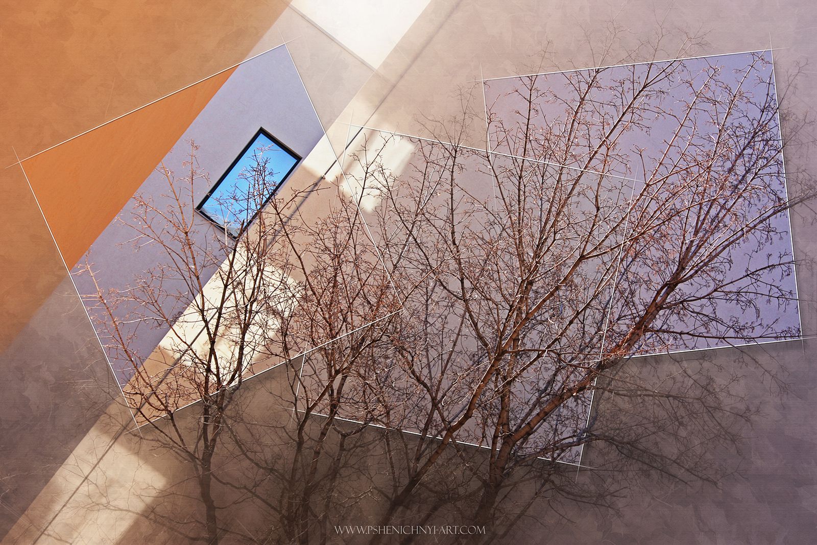 Фотография ветвей клёна на фоне яркой стены здания снята в небольшом уютном городском дворике солнечным апрельским вечером. Композиция снимка интерпретирована в накладывающиеся друг на друга квадраты, отличающиеся по яркости и контрасту с основным фоном, и придающим фотографии особое настроение.