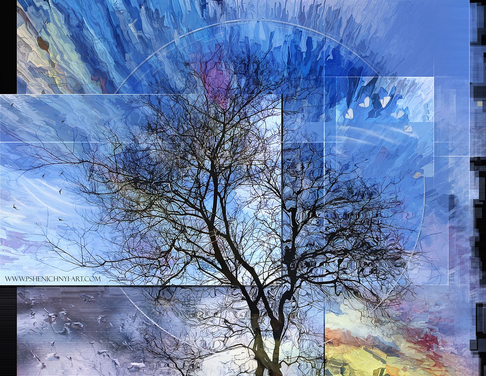 Фотография кроны дерева снята ясным весенним днём. В графическом редакторе было использовано наложение других графических элементов для создания фееричного весеннего настроения.