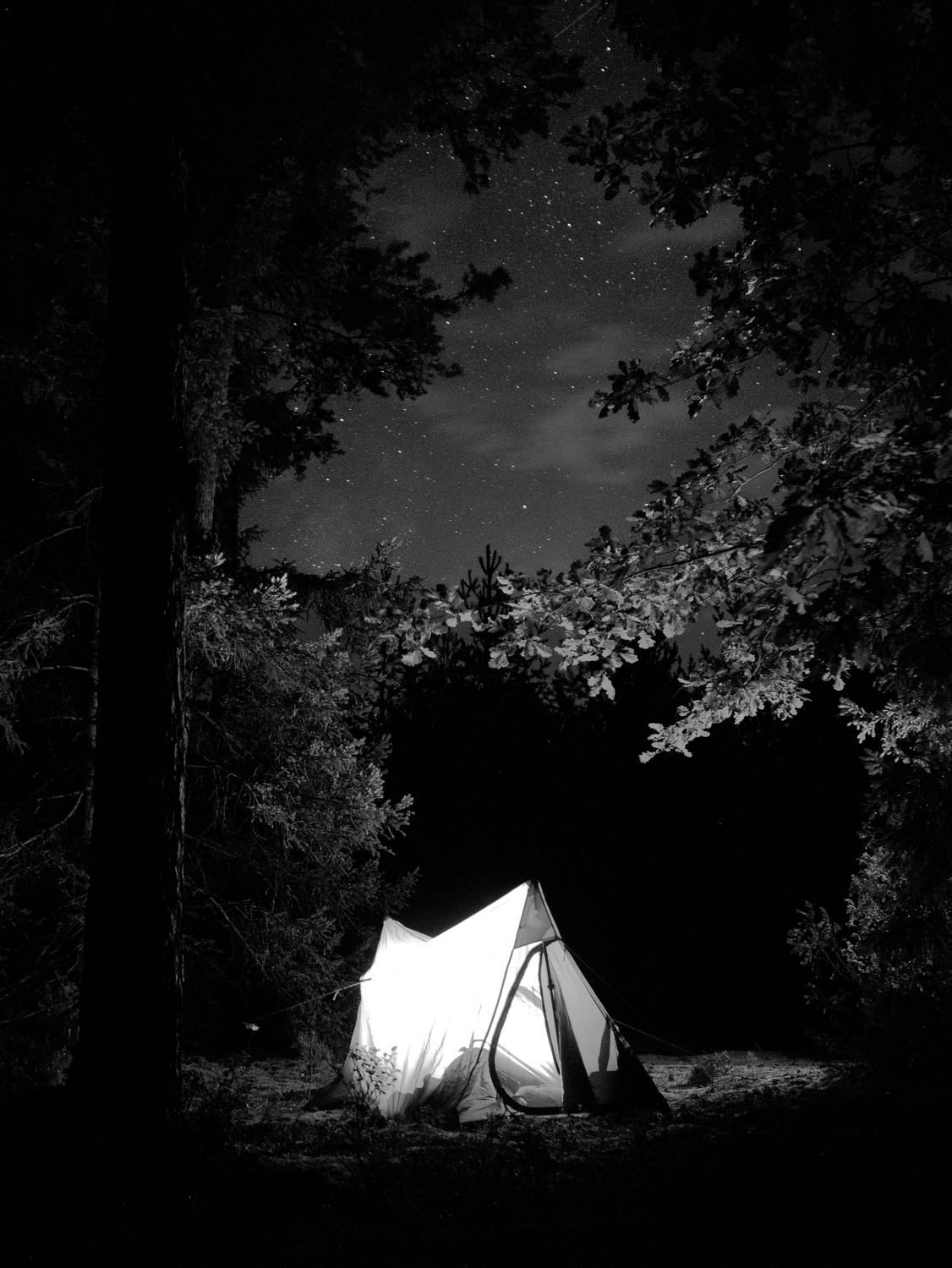 Эта серия из двух кадров, что довольно редко для меня, получилась полностью монохромной. Так, на мой вкус, вышло лучше всего передать атмосферу летнего ночного леса, времяпровождения в нём, ночёвки. А почему работа именно про мгновения? А всё просто: именно такими обрывками воспоминаний мне запоминаются походы и просто ночёвки на природе.