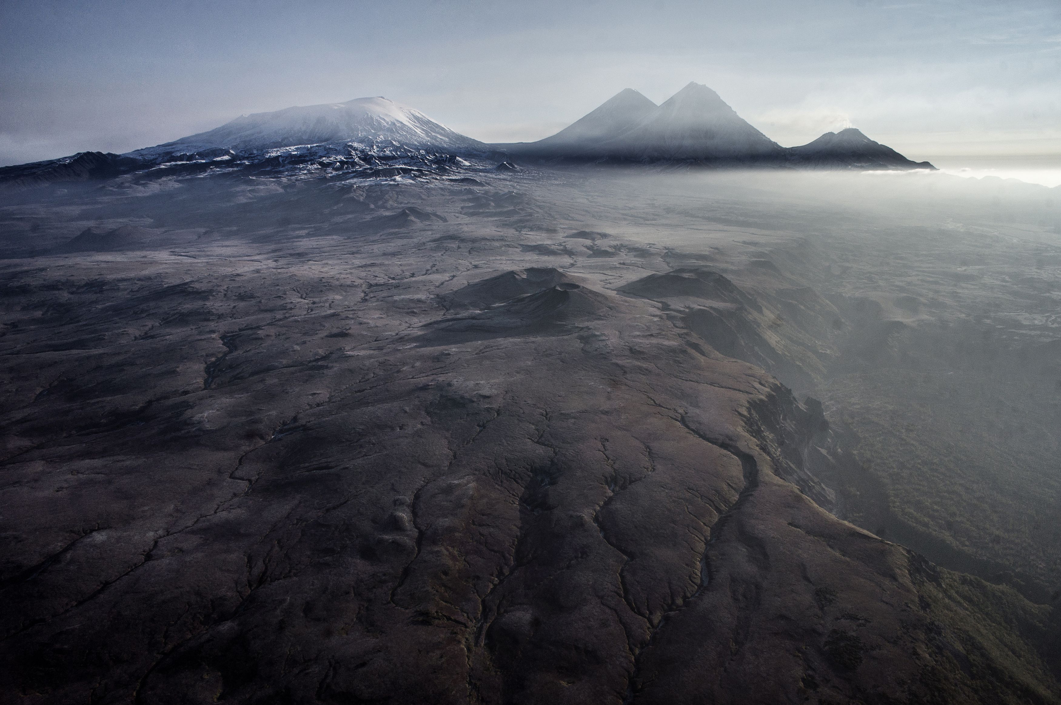 Аэрофотография Андрея Абрамова запечатлела драматический ландшафт с вулканическими горами, утопающими в тумане, и разбитой землёй на переднем плане. Снежные вершины контрастируют с тёмной, изрезанной поверхностью, создавая ощущение первозданной мощи природы. Снимок передаёт атмосферу изоляции и суровости арктической или субарктической местности.