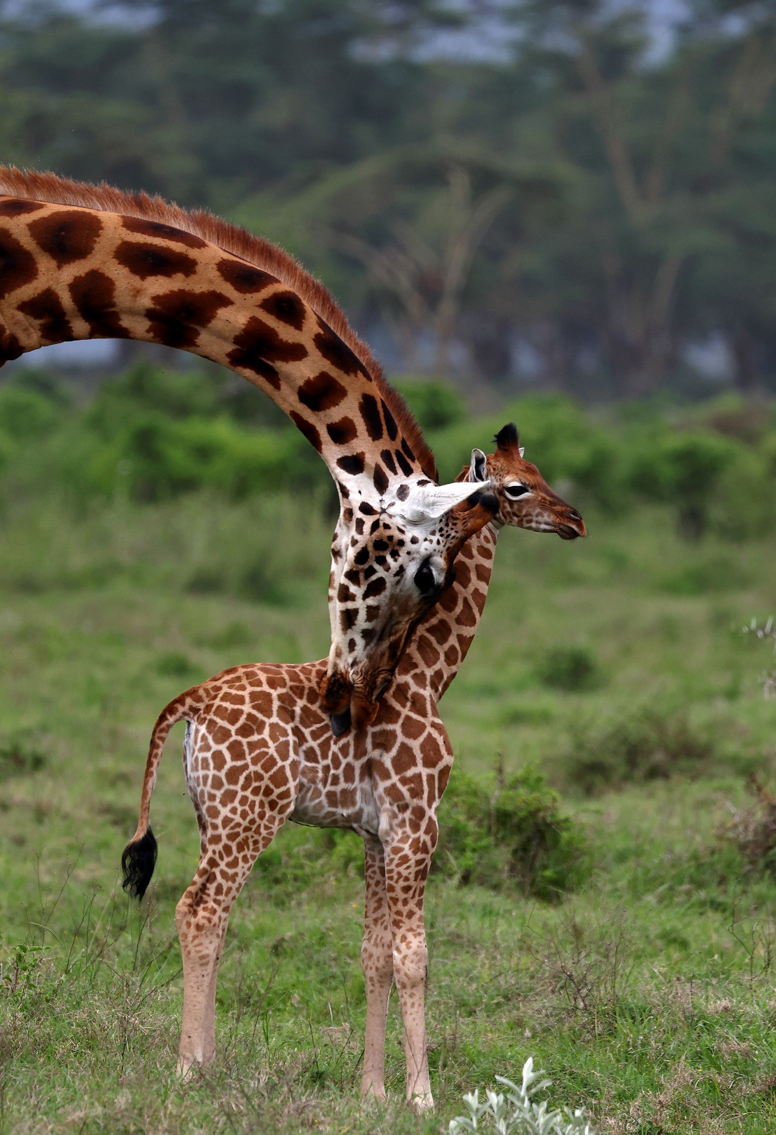 На фотографии запечатлён трогательный момент: взрослый жираф наклоняет свою длинную шею, чтобы коснуться головой маленького детёныша, стоящего рядом. Сцена происходит на фоне зелёной саванны, где видны кустарники и размытые деревья. Изображение передаёт естественную связь между родителем и потомством в дикой природе. Фотография отражает спокойствие и гармонию африканской экосистемы. Автор — Гудков Андрей.