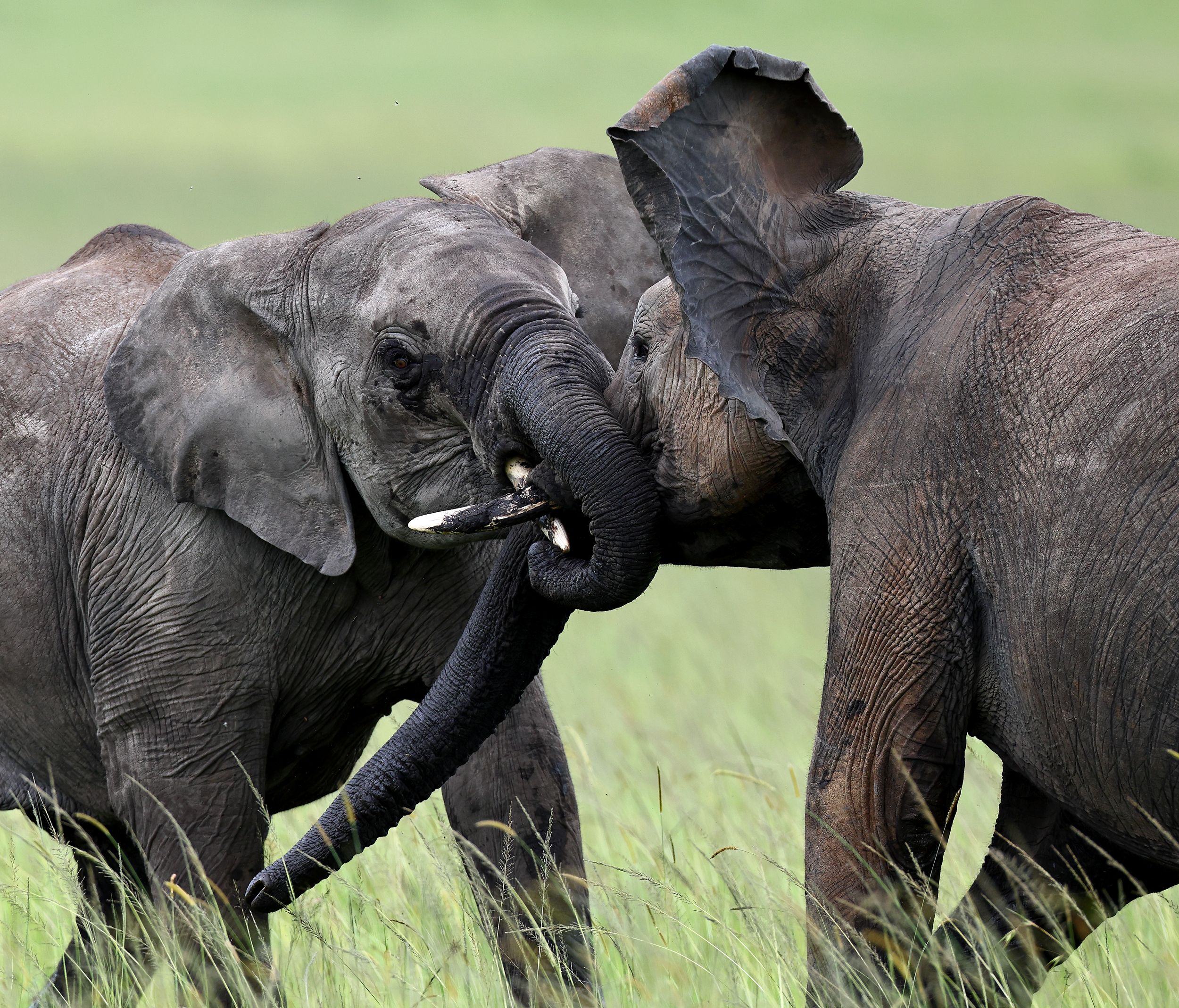 На снимке запечатлен момент взаимодействия двух слонов в травянистом ландшафте — их хоботы переплетены, что указывает на социальное поведение. Композиция сфокусирована на деталях кожи и выражении глаз, передающих естественность и близость животных.