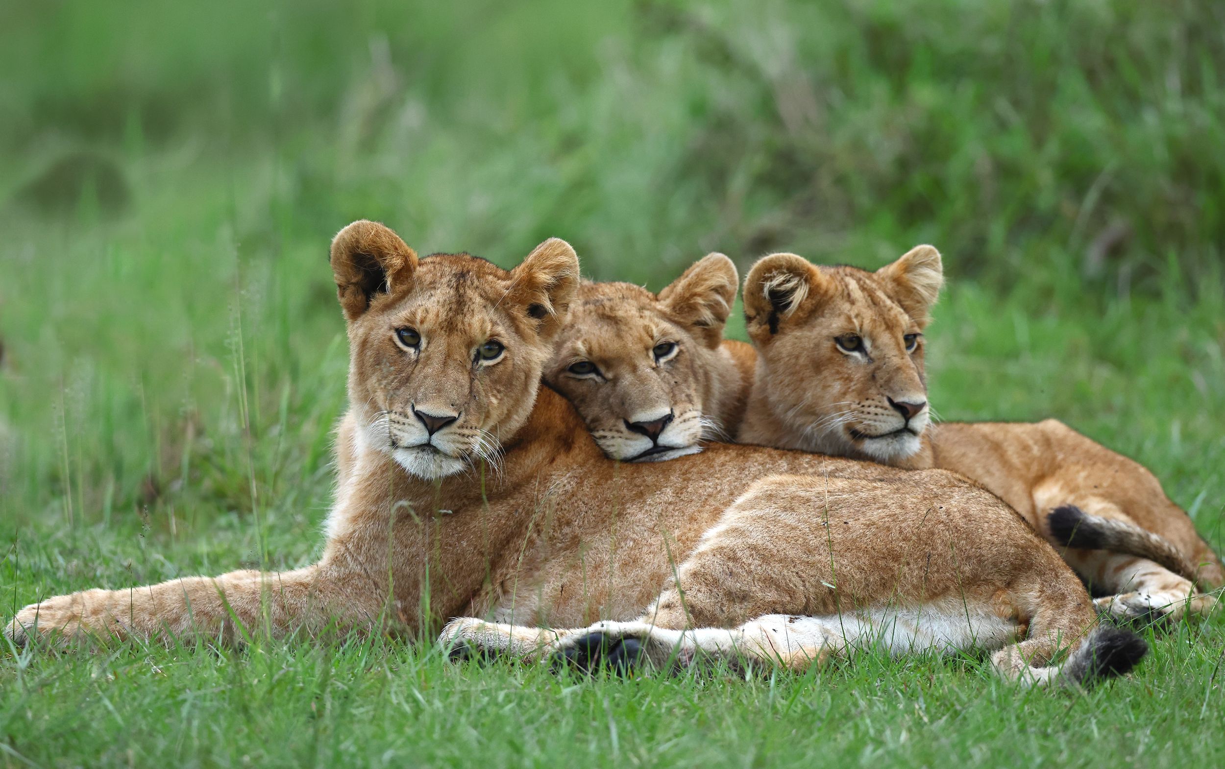 Три львицы лежат в густой зелёной траве, плотно прижавшись друг к другу. Их тела расслаблены, взгляды спокойны — одна смотрит прямо в камеру, другая — в сторону, третья — с закрытыми глазами. Сцена передаёт умиротворение и естественную связь между животными в их среде обитания. Фотография запечатлела момент тишины и близости в дикой природе, подчёркивая гармонию и спокойствие. Фотограф: Гудков Андрей.