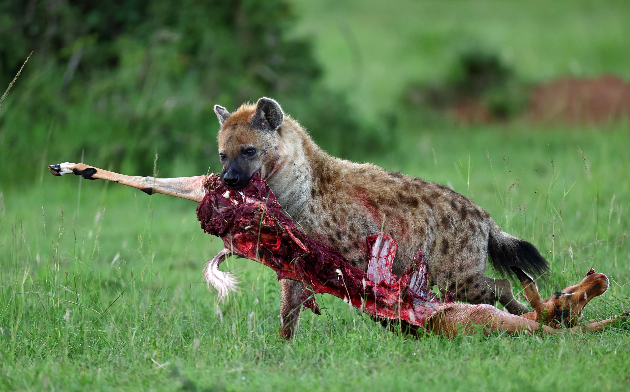 Вы хорошо поймали момент — гиена с добычей в кадре, динамика и детали вроде крови и шерсти переданы чётко. Снимок выглядит естественно, без искусственных эффектов.