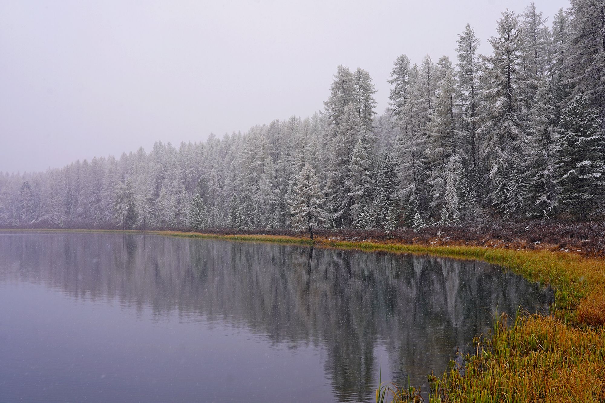 "Классической" карточки с озера Киделю (ну вы знаете, с отражением снежных вершин в зеркале озера и ожерельем золотистых лиственниц), увы, не получилось. Утро выдалось туманно-хмурым и не по-сентябрьски малоснежным :). Посему наша группа фотографов довольствовалась тем, чем нас одарила Природа.