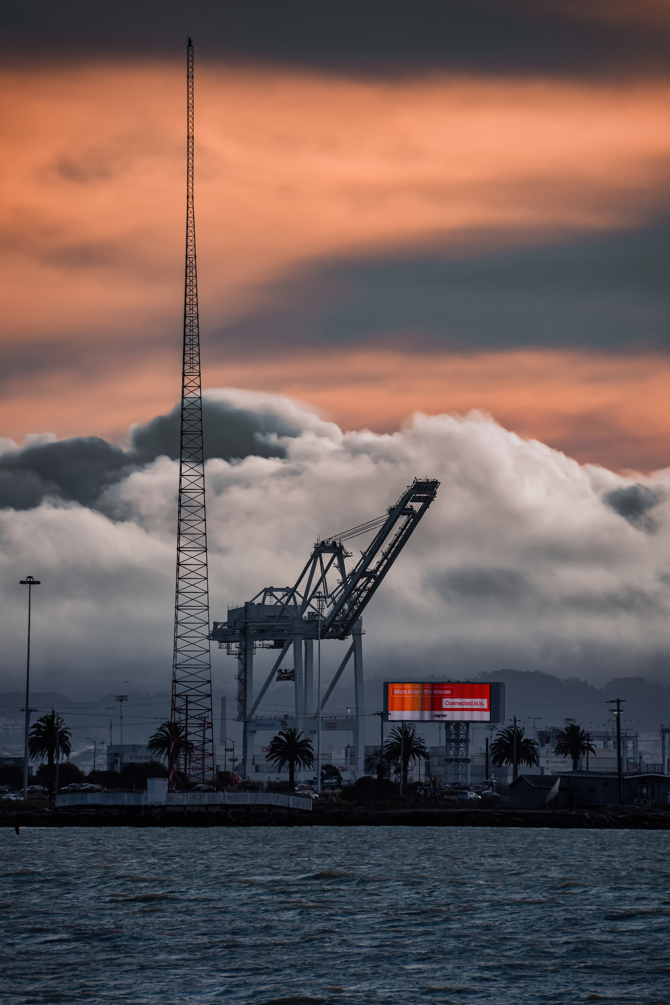 Tall port cranes and a slender antenna tower rise above the Port of Oakland, surrounded by low, rolling fog. A warm orange sky glows above the heavy clouds, while palm trees and a red digital billboard sit in the distance near the waterfront.
