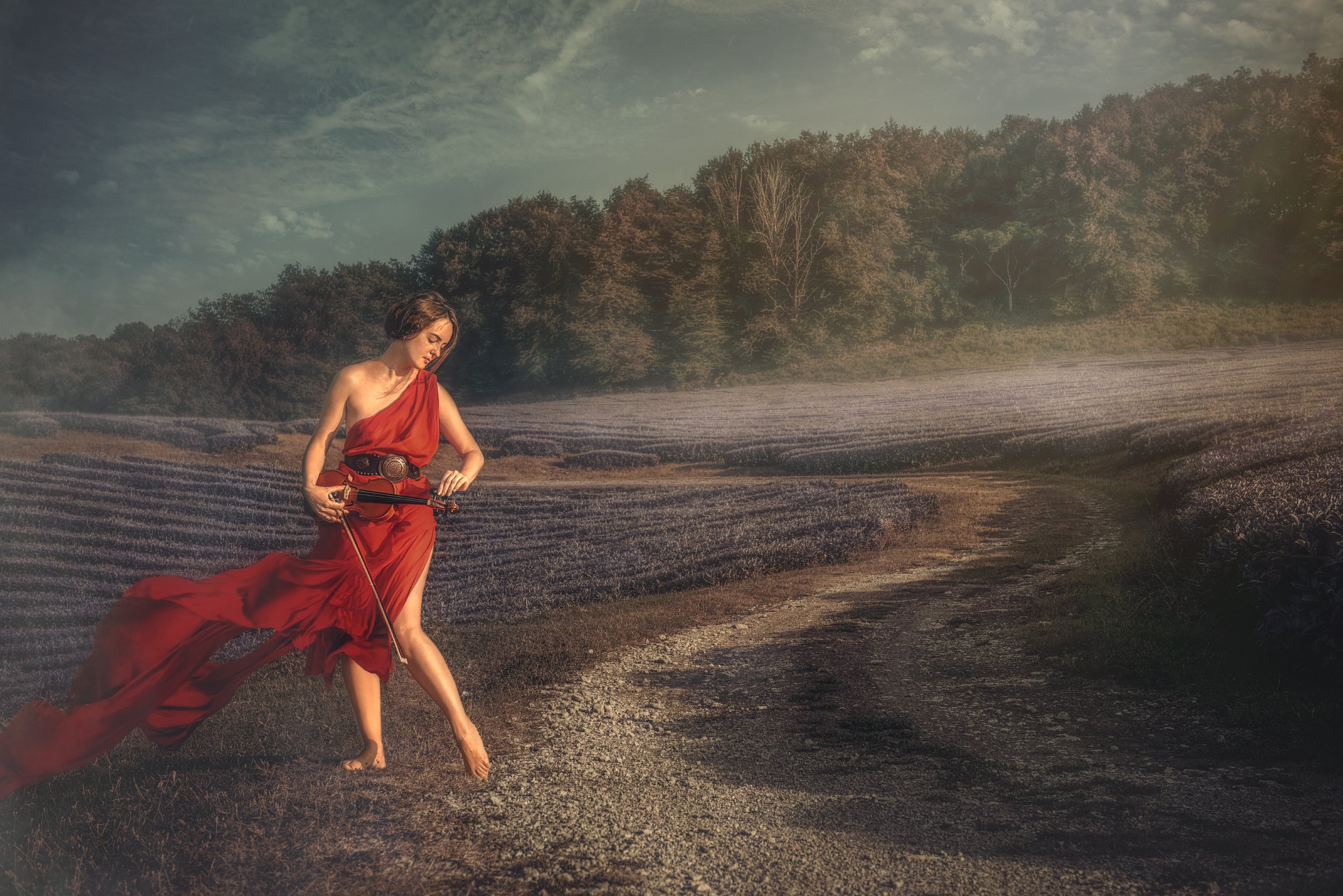 девушка скрипка лаванда поле закат играет дорога, Андрей Володин