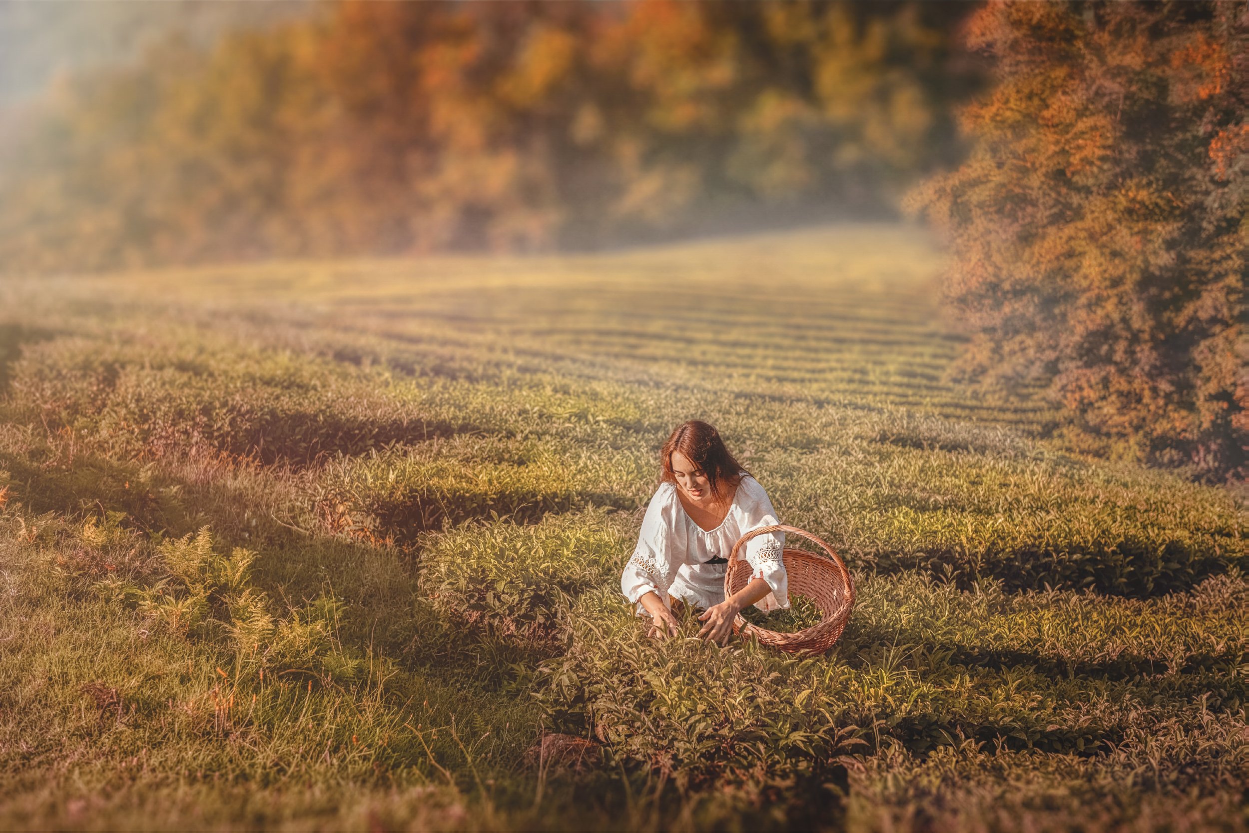осень чай селянка девушка корзина поле плантация солнце закат, Андрей Володин