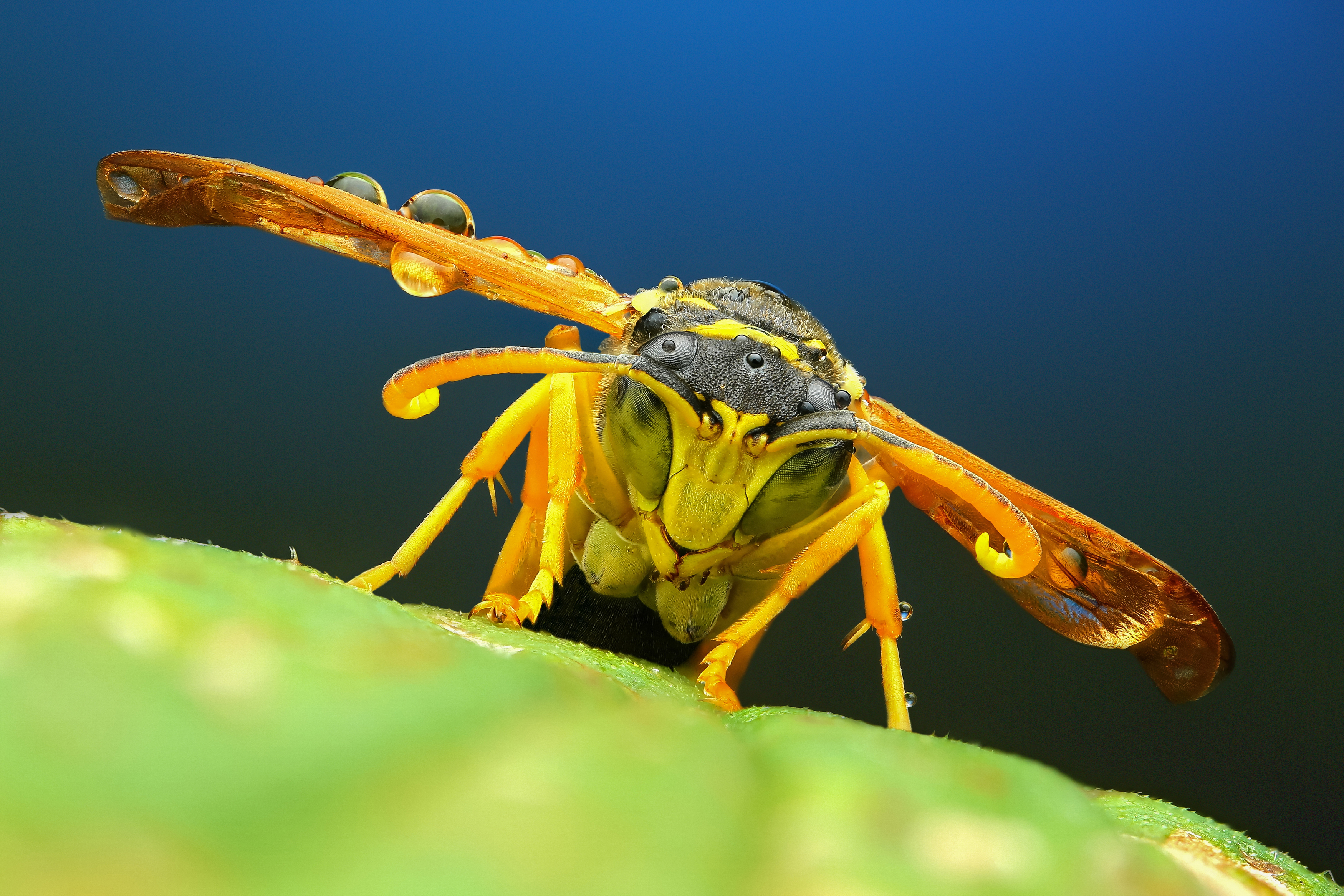 макро, природа,насекомое,животное,растение,оса,лист,цвет,желтый,синий, Андрей Шаповалов