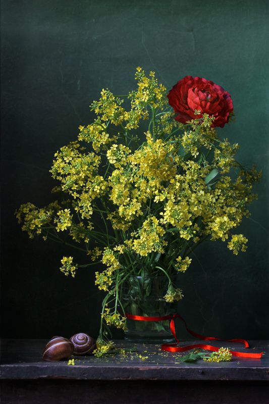 натюрмортцветыжелтыйбукетсурепкаранункулюсракушкизеркало