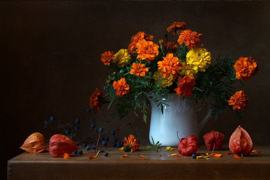 натюрморт, цветы, бархатцы, физалис, девичий виноград, Курочкина Диана