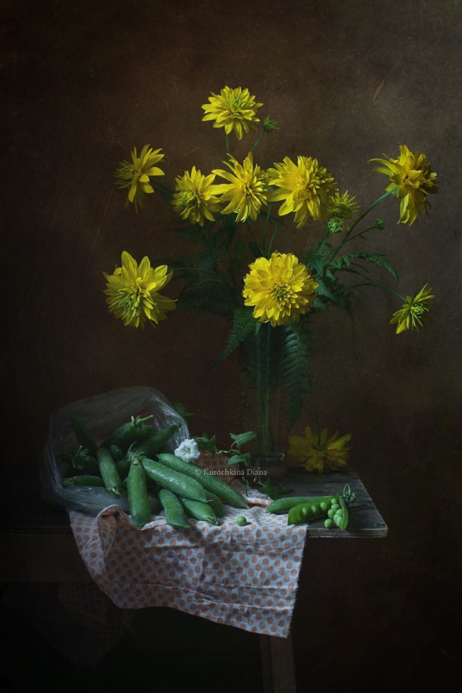 натюрморт, цветы, букет, золотые шары, рудбекия, горох, июль, Курочкина Диана