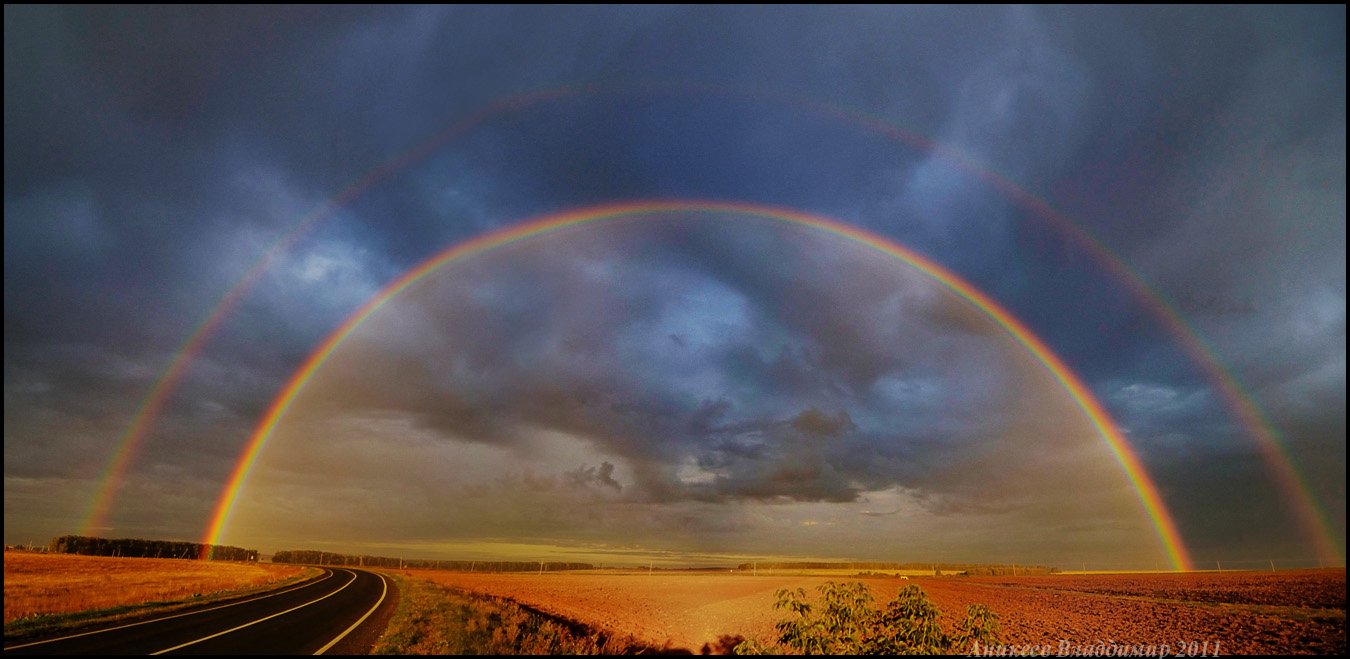 Раннее утро,впереди надвигается и накрывает ливень, все небо в облаках, а сзади восходит солнце и у горизонта встала двумя арочными мостами двойная радуга. Обе радуги даже не вошли в кадр, пришлось сшивать панораму.