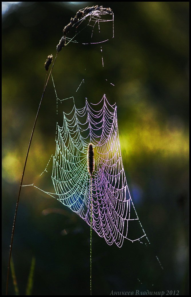 Роса на паутине в лучах восходящего солнца всегда смотрится интересно. Но недавно начал замечать что при некоторых ракурсах на снимках проявляется радуга, причем видна она только после съемки.