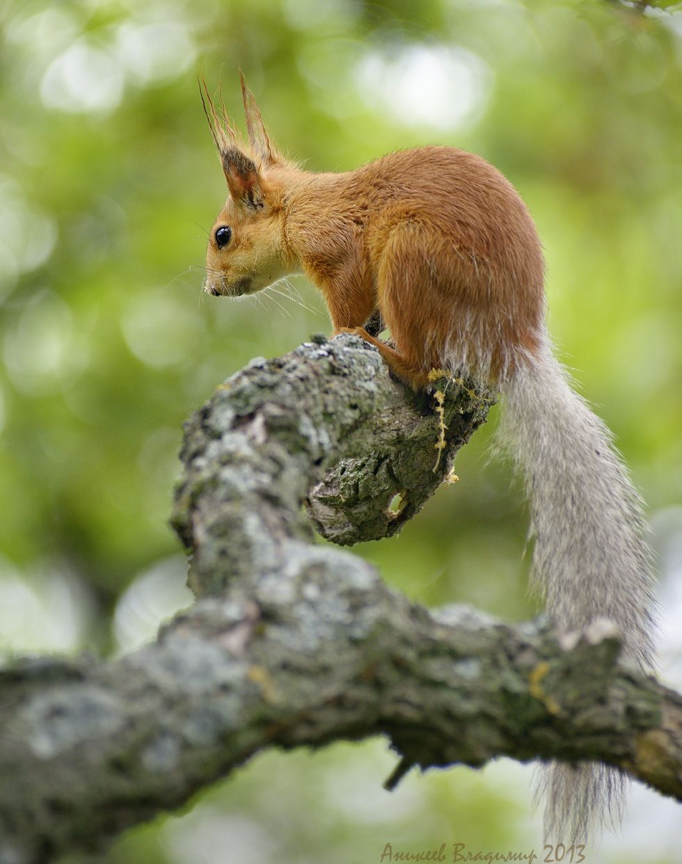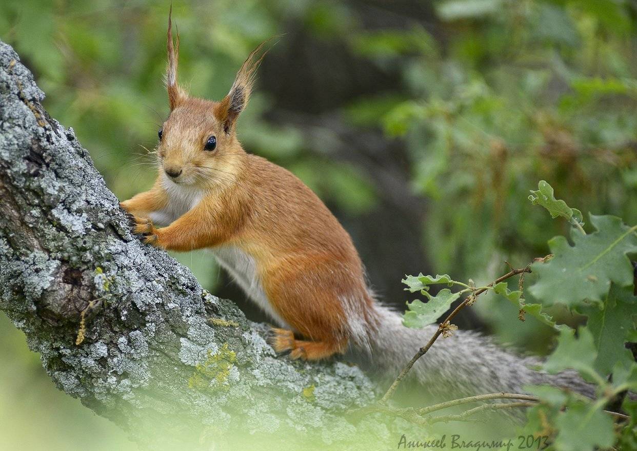 Крымскую белку застал за активной кормежкой на крутом склоне, в небольшой дубраве. Сначала она нашла орех, погрызла, но потом решила отложить до лучших времен и спрятала его в развилке ветвей. И поскакала дальше, я поскакал по крутому склону за ней... А лапочка-белка, которая как известно из всех сказок питается орешками (и шишками) занялась странным на мой взгляд делом- начала активно грызть концы дубовых веток, что- то выгрызая, так что только пыль летела и съедая, но я долго не мог увидеть и заснять, что все-таки она ест? Пока в удобном для съемки месте из одной из веток она не вытащила здоровую гусеницу и с аппетитом схрумкала ее. Вот тебе и крымчанка- вегатарианка...