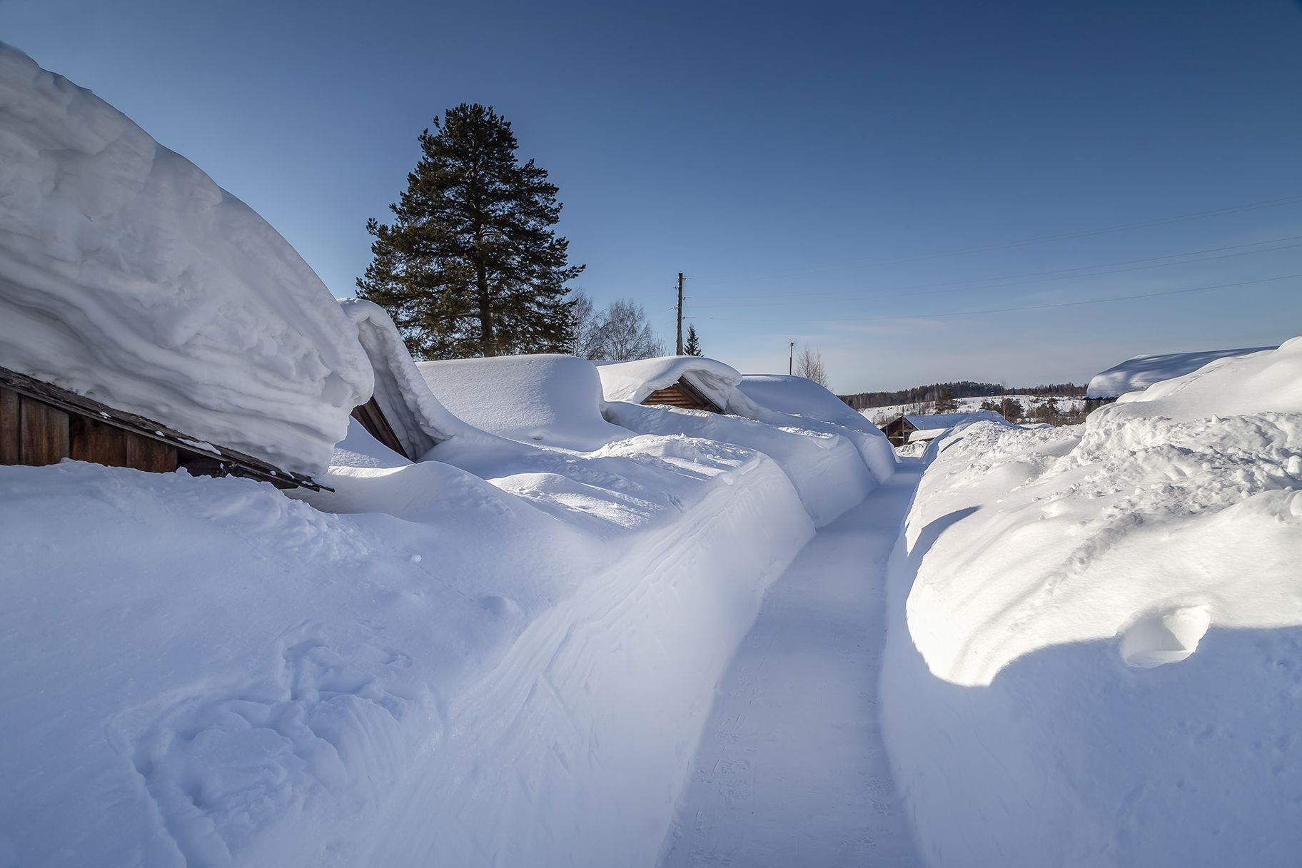 тропинкаснегсугробтенидеревнястроения.