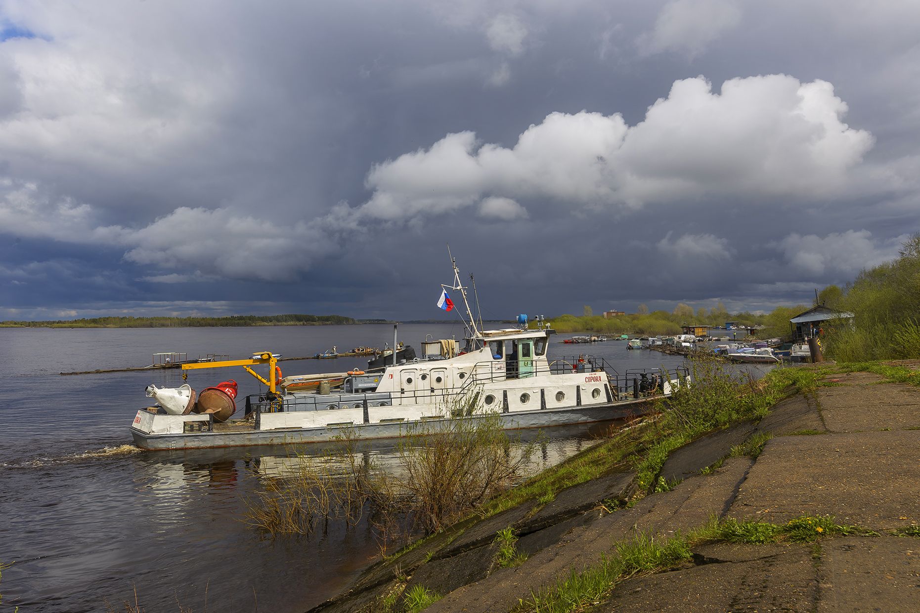 река, вычегда, катер, пристань, причал, полноводье, небо, тучи., Анкудинов Леонид