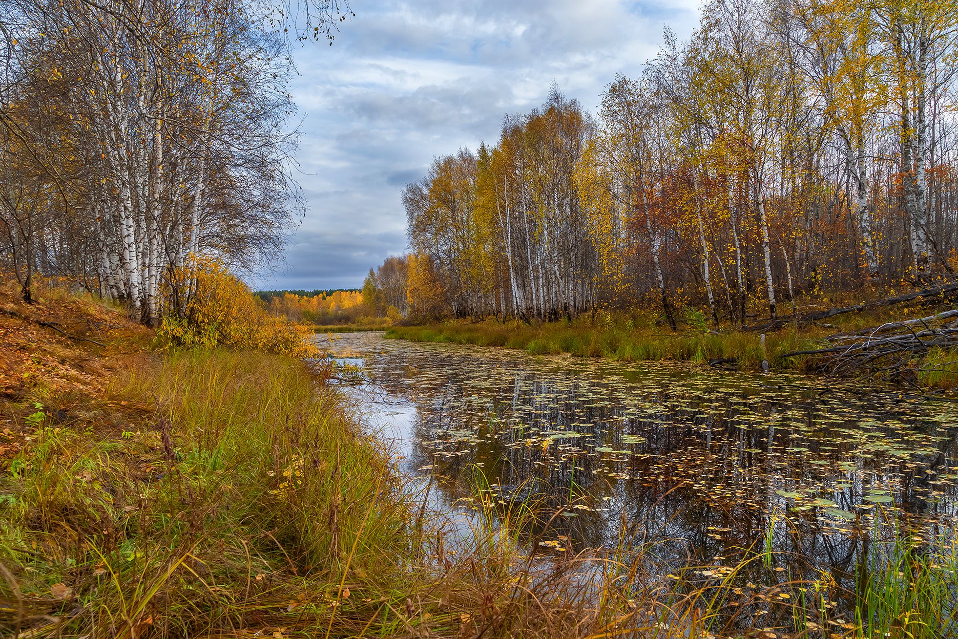 осень, озеро, берёзы, жёлтый, листопад, берега, трава., Анкудинов Леонид