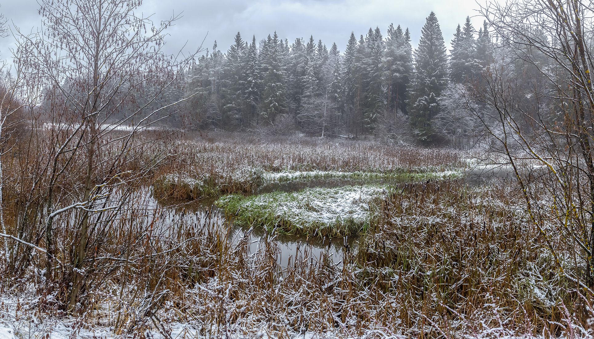 пруд, лес, заросли, снег, трава, Анкудинов Леонид
