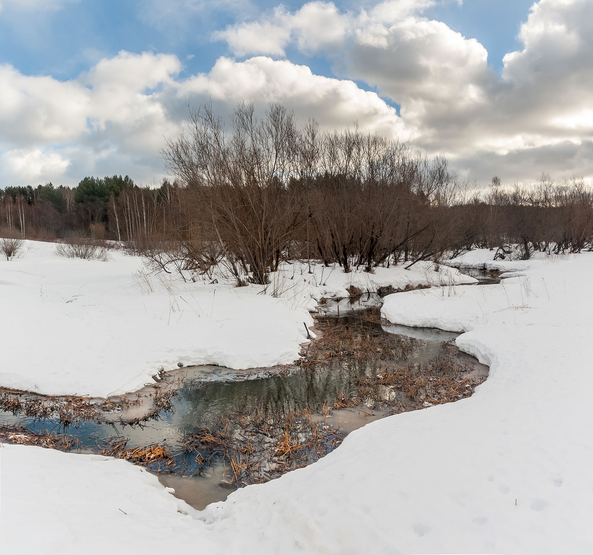 весна, снег, ручей, промоина, кустарник, русло, небо., Анкудинов Леонид