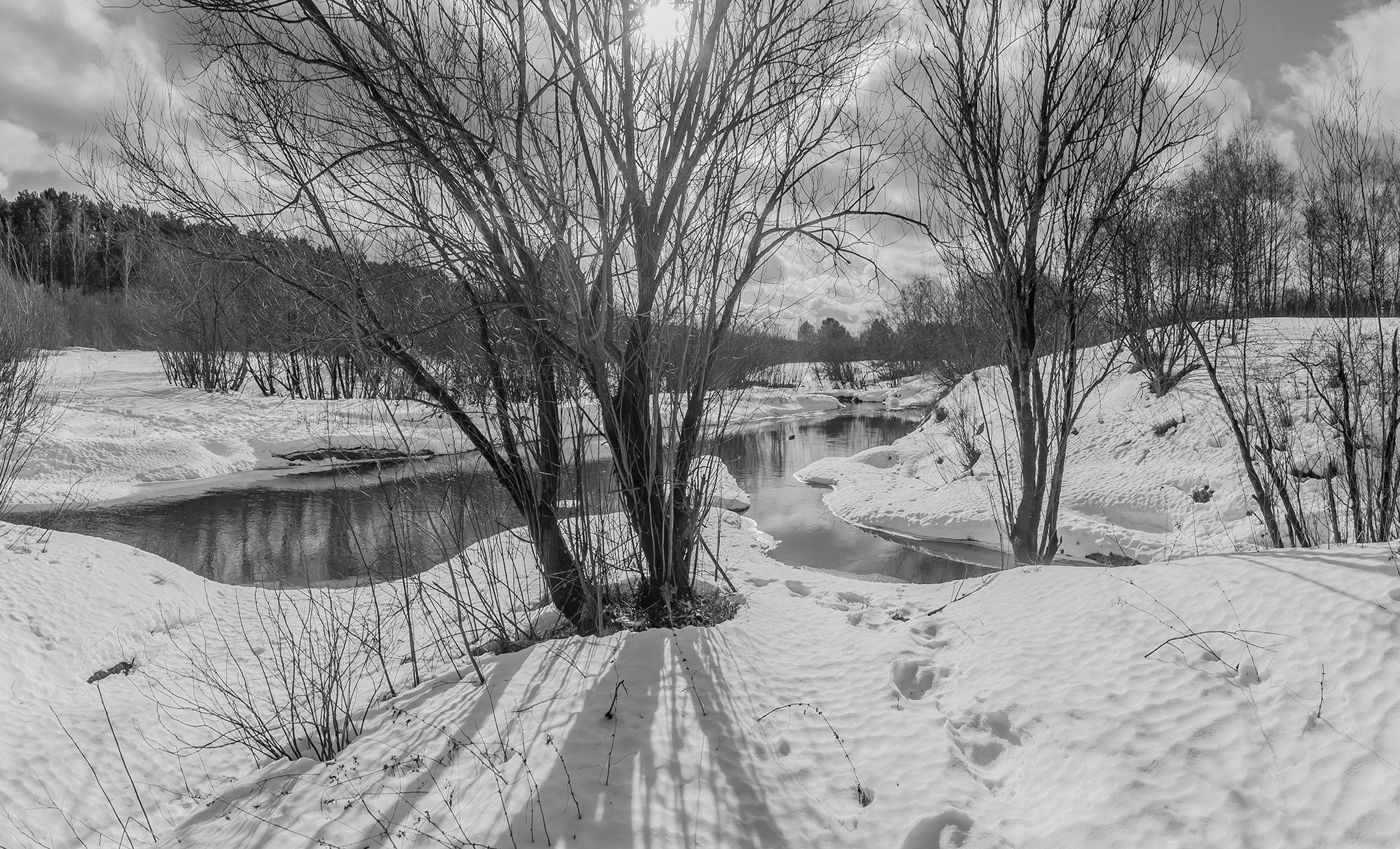 весна, снег, речка, кустарник, солнце, следы., Анкудинов Леонид